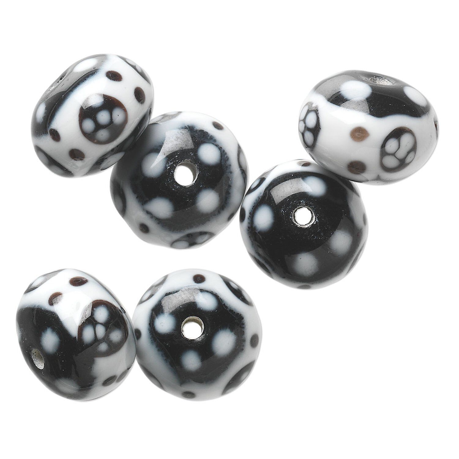 Bead, lampworked glass, opaque white and black, 15x11mm-17x12mm rondelle with flower and dot design. Sold per pkg of 6.