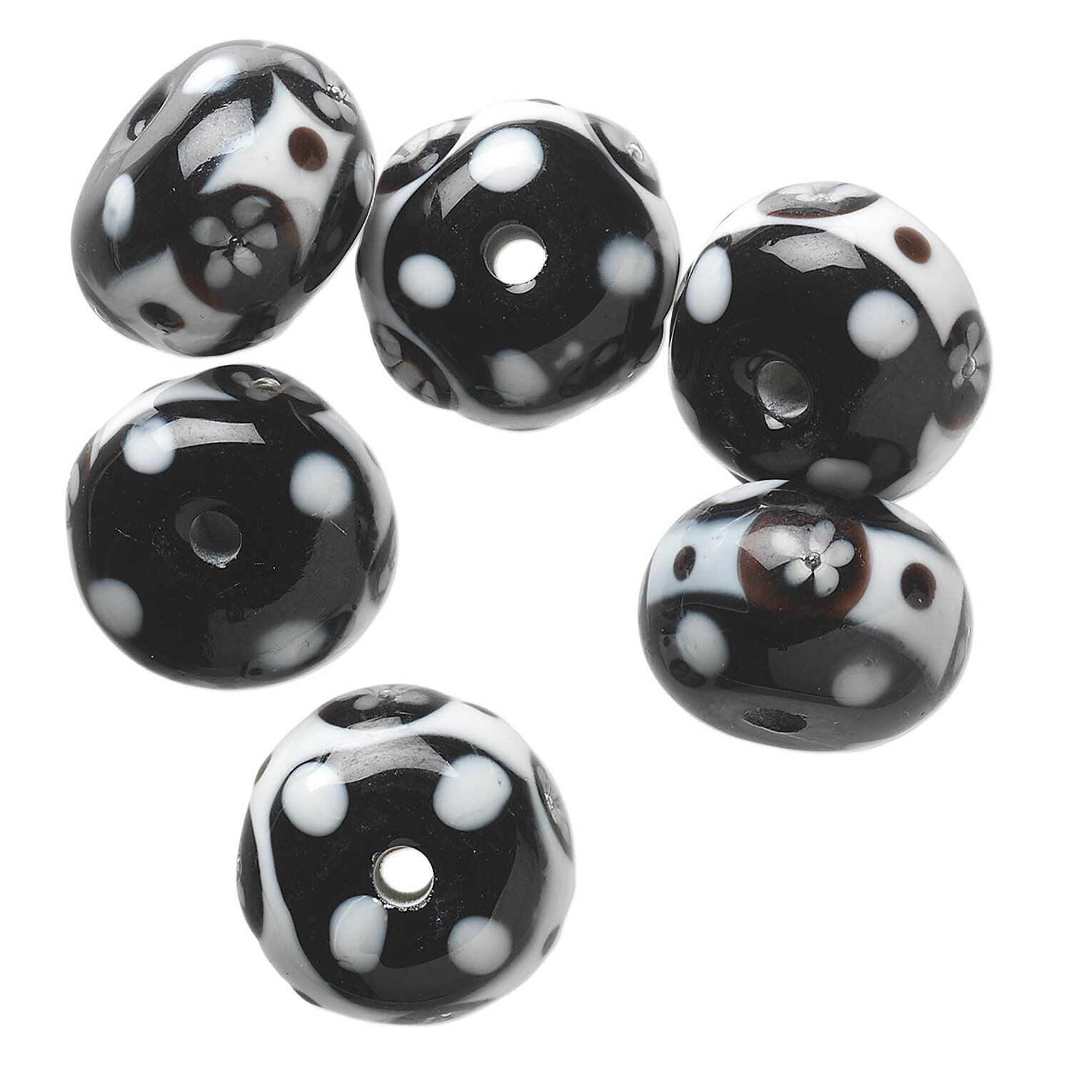 Bead, lampworked glass, opaque white and black, 17x12mm rondelle with flower and dot design. Sold per pkg of 6.
