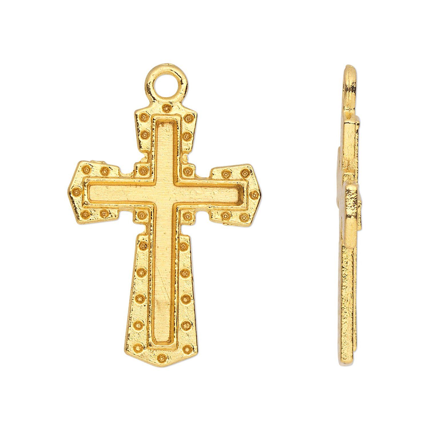 Drop, gold-finished "pewter" (zinc-based alloy), 28x20mm single-sided cross. Sold per pkg of 10.