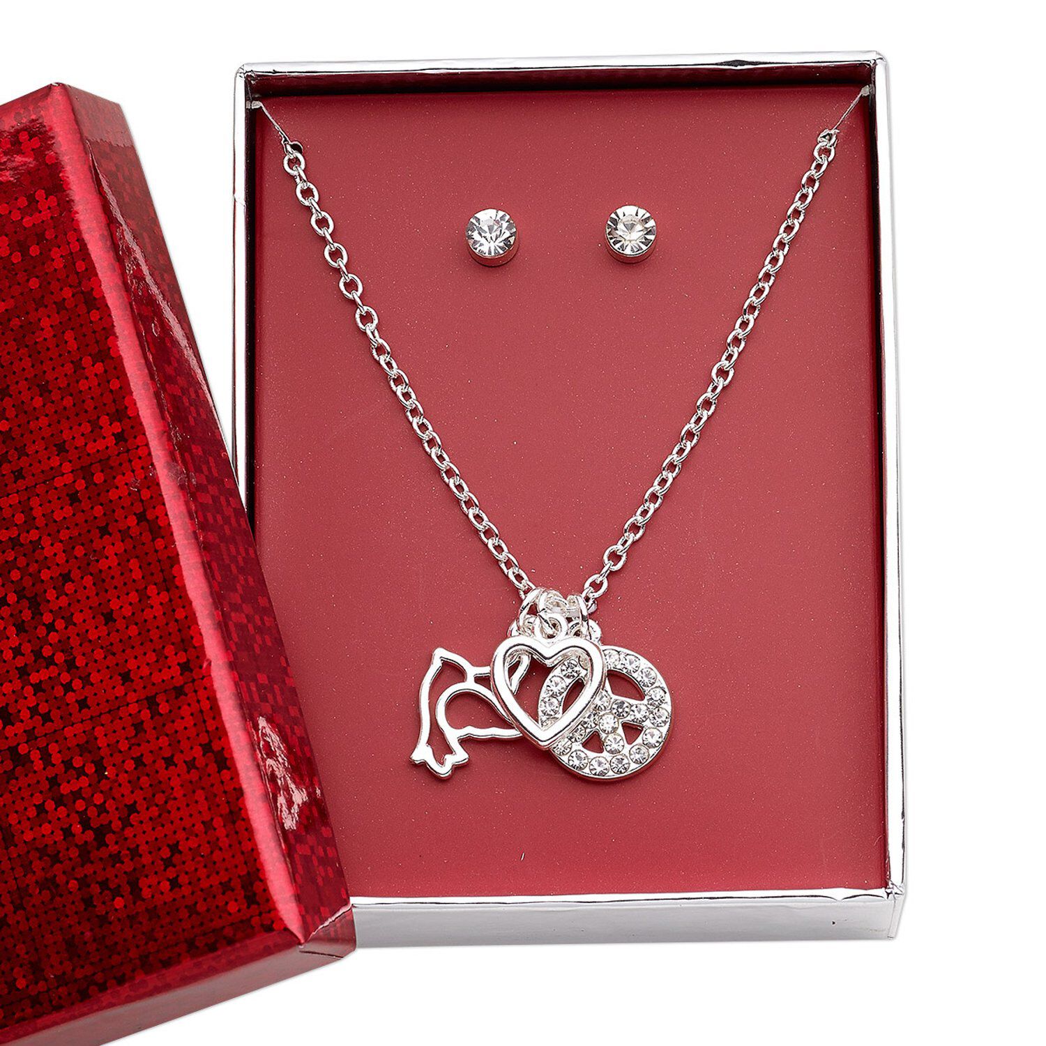 Customers will love this jewelry set featuring sparkling rhinestone post earrings and three pendants: a heart, a dove and a peace sign. Adjustable closure suits a range of neck sizes. Ready-to-wear necklace is ideal for gift-giving, counter sales or extending current jewelry lines. Comfort clutch earnuts included.