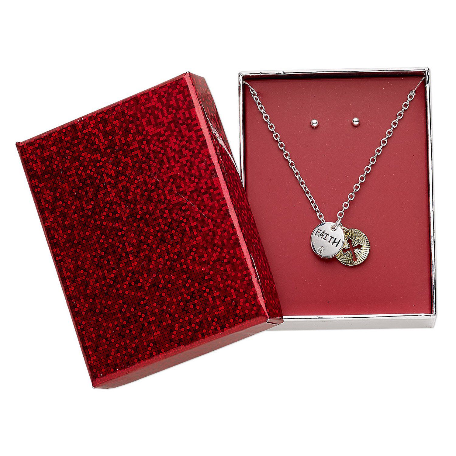 One 13mm round has a silver finish and the word "FAITH" with a single clear glass rhinestone adornment while the second 13mm round has a gold finish and cross cutout with a radiating line design. Both gleaming metals testify to the beauty of this faith-based jewelry set ideal for gift-giving and resale opportunities. Attractive retail-ready packaging houses this necklace and earring set for a complete presentation. Comfort clutch earnuts included.