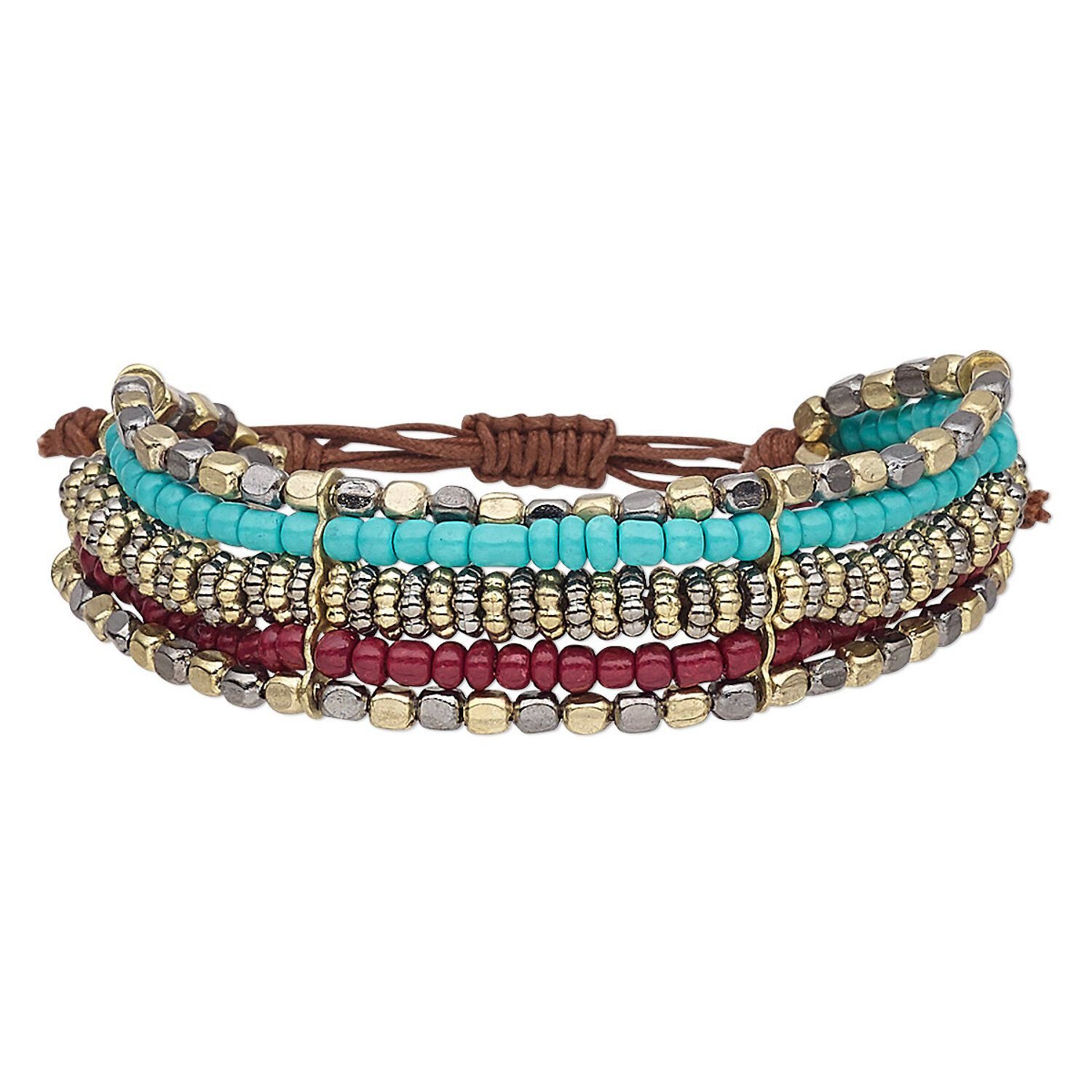 Glass seed beads, acrylic, and gunmetal-plated plus gold-finished beads cover this waxed cotton cord bracelet for a visually and texturally intriguing addition to your jewelry collection. Colors can include brown, black, turquoise blue and red.