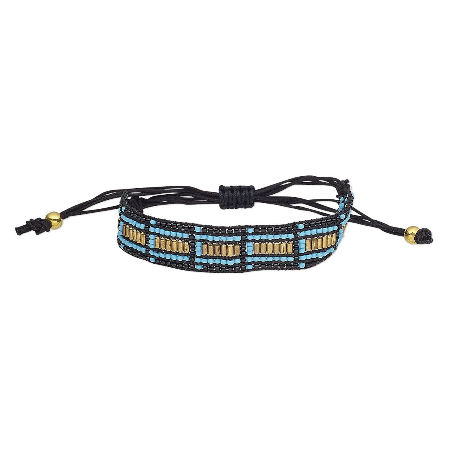 Bracelet, waxed cotton cord / glass / gold-finished steel, black and turquoise blue, 16mm wide, adjustable from 6 to 9-1/2 inches with macramé knot closure. Sold individually.