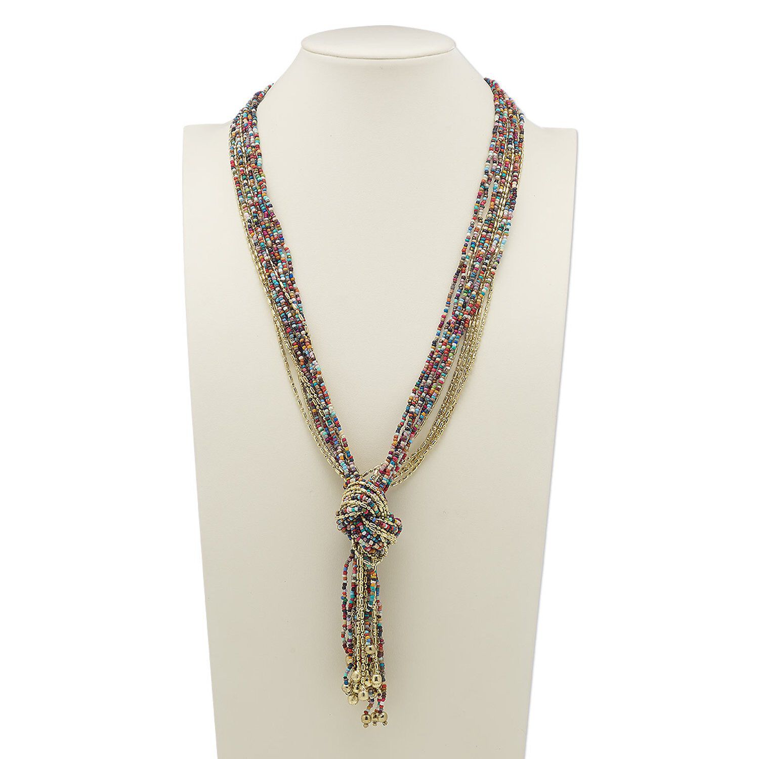 Necklace, 11-strand, glass and gold-finished steel, multicolored, 30 inches with knot. Sold individually.