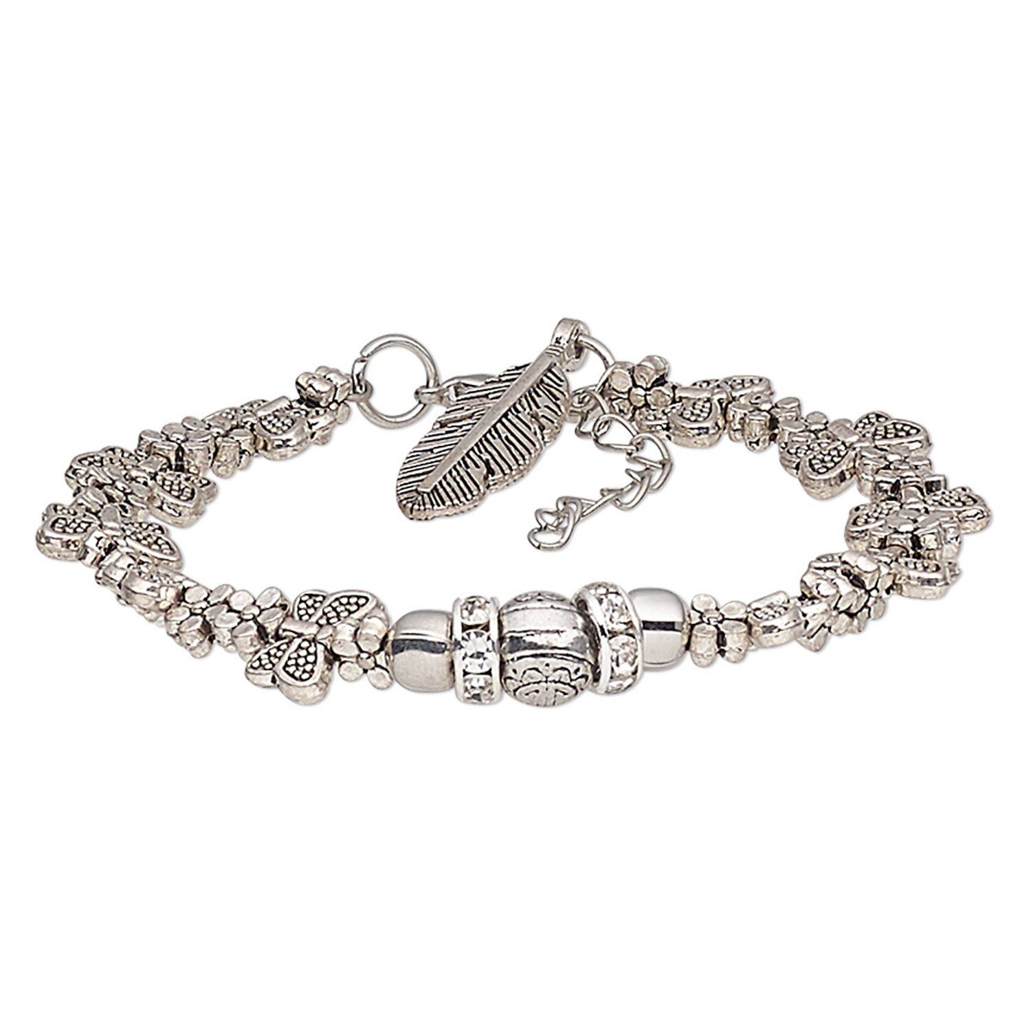 This gleaming antique silver color bracelet is adorned with petite butterflies, flowers, a feather charm and accent beads including rondelles set with glittering glass rhinestones.