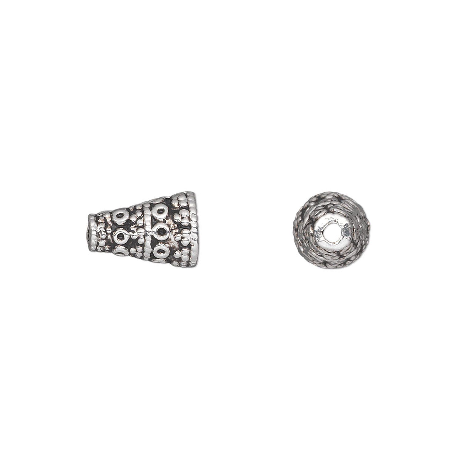 Cone, antique silver-plated "pewter" (zinc-based alloy), 10x7mm textured, 4.5mm inside diameter. Sold per pkg of 50.