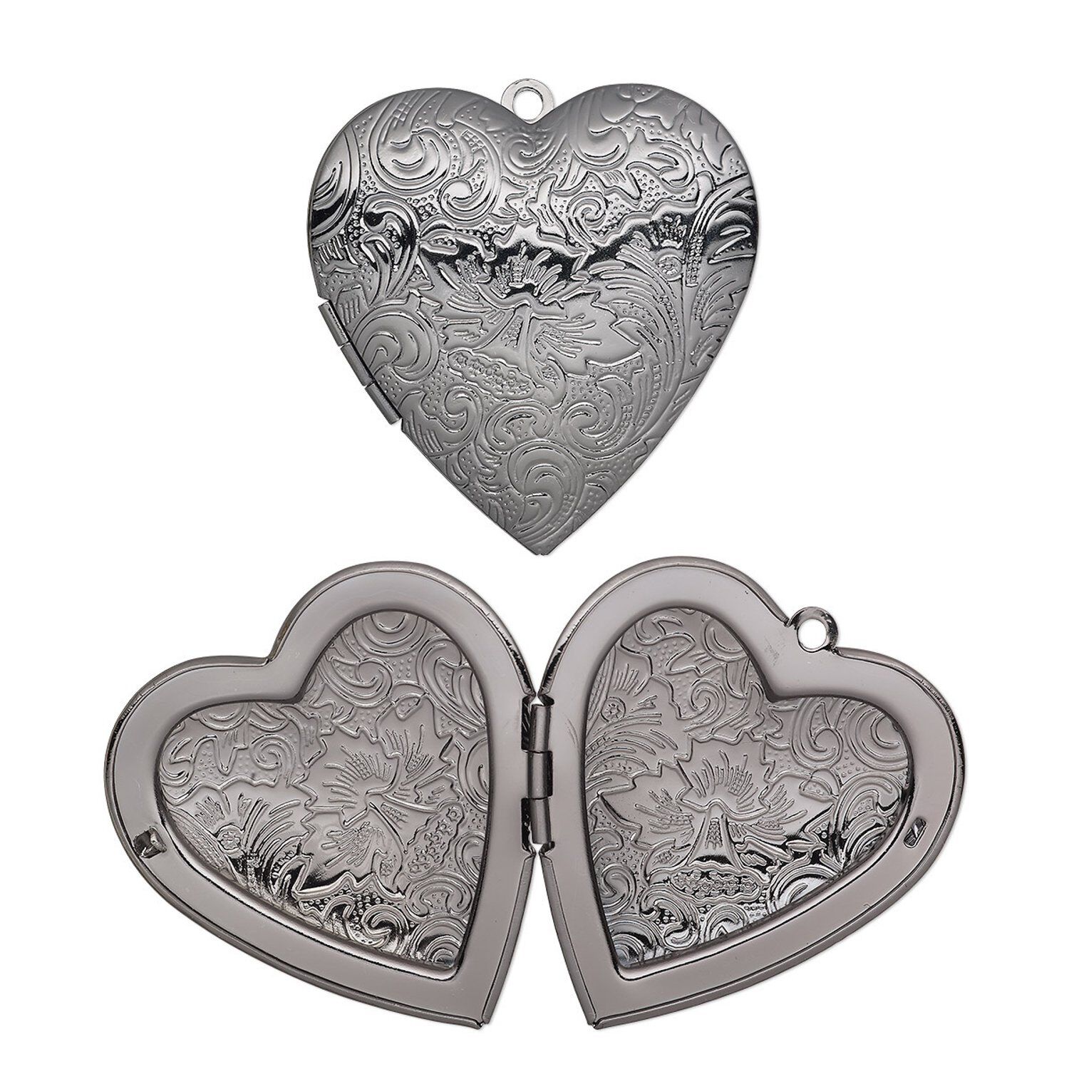 Lightweight gunmetal-plated brass heart locket can be filled with photos, crystal embellishments, ICE Resin®, Apoxie® Sculpt, Mod Podge® Dimensional Magic and more. Etched flower and scroll design is on both sides of locket.