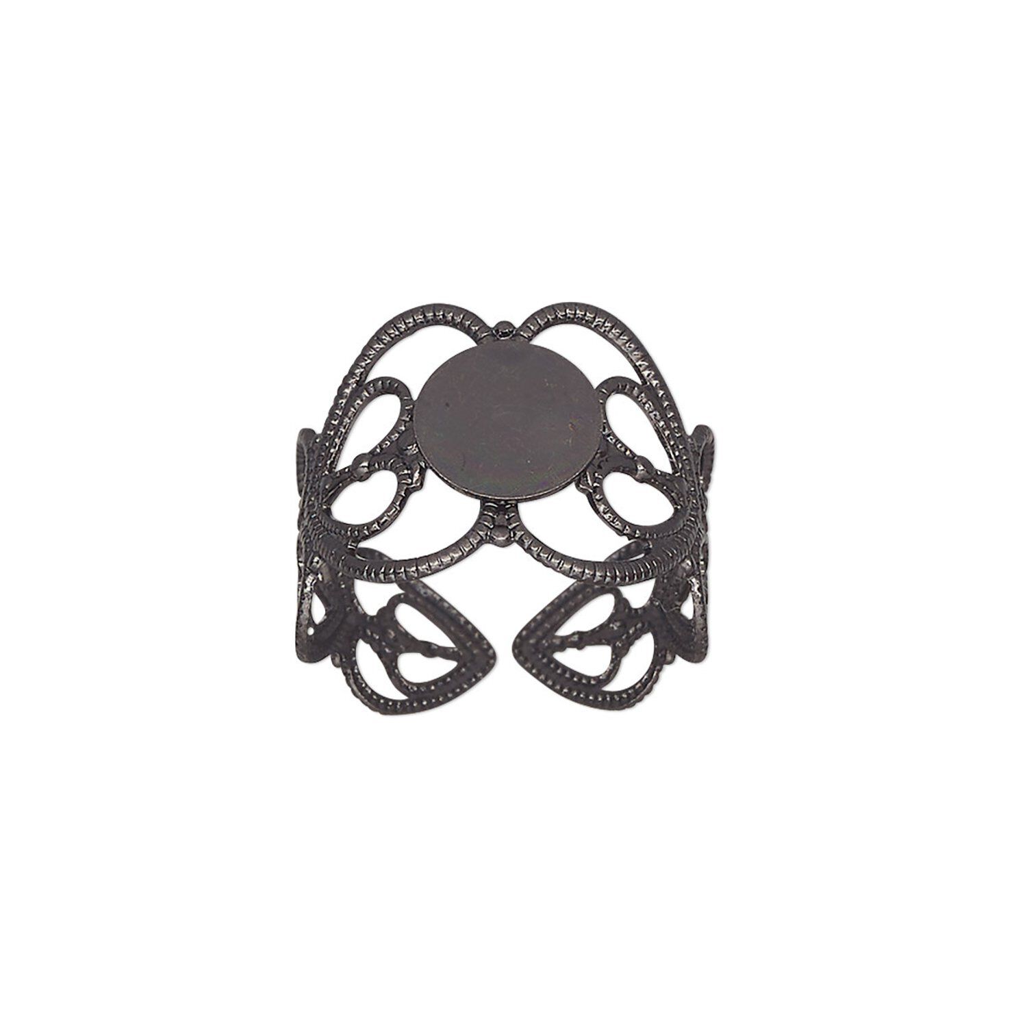 Ring, gunmetal-plated brass, 14mm wide with double heart and 8mm round flat pad setting, adjustable from size 7-9. Sold per pkg of 8.