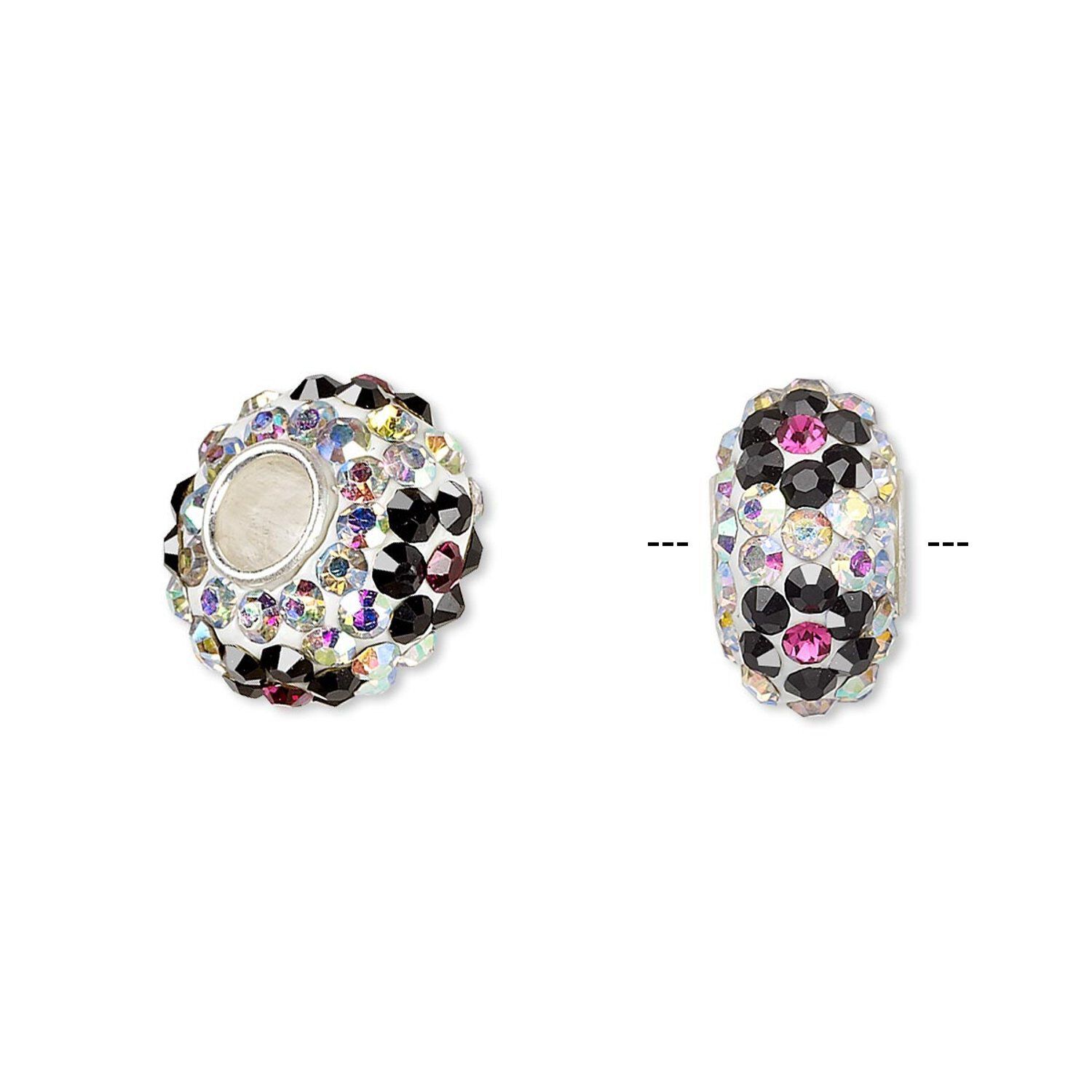 Dione® pavé-style large-hole bead is designed with faceted Czech glass rhinestone chatons set in epoxy with a sterling silver grommet. Bead features a black and pink flower design and slides easily onto Dione® Easy-On chain, caprice chain or other cord for personalized style. Colors can include white, clear AB, black and pink. Bead has a 4.5mm inside diameter. Stones are hand-set so patterns and colors may vary.