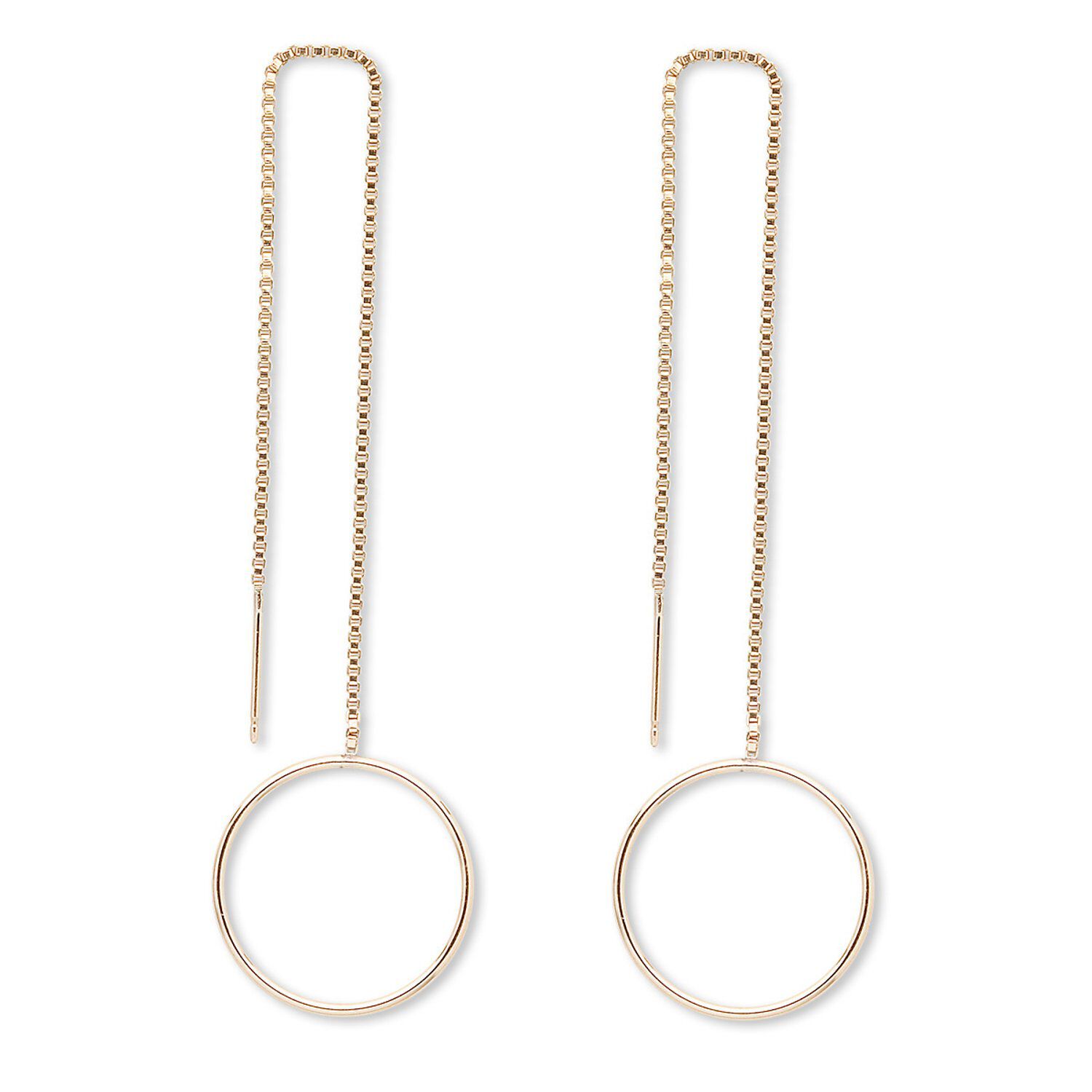 Gold-filled ear threads. Easy-on, just thread through pierced holes. They dangle free and fluid on a long chain.