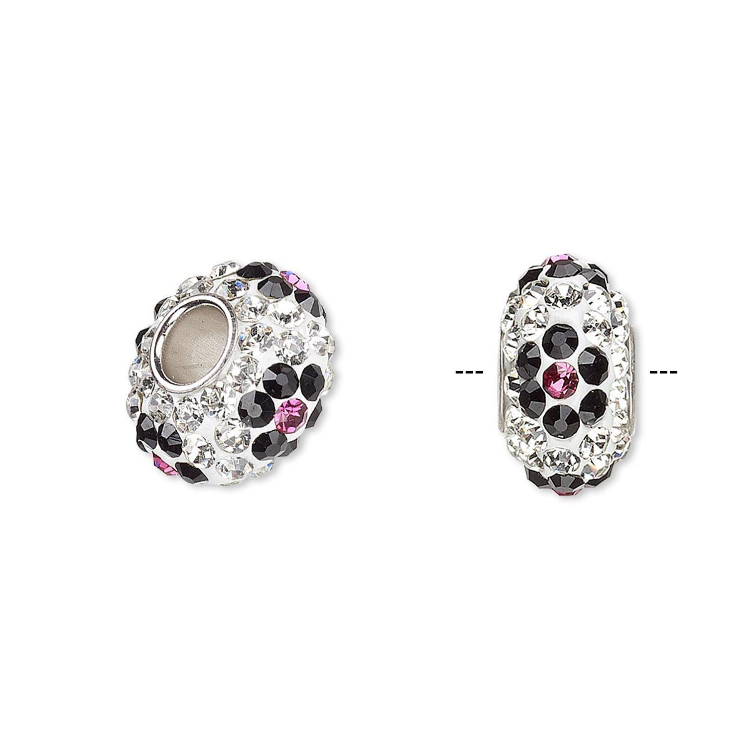 Dione® pavé-style large-hole bead is designed with faceted Czech glass rhinestone chatons hand-set in epoxy with an imitation rhodium-plated brass grommet. Bead features a multicolored flower design and slides easily onto Dione® Easy-On chain, caprice chain or other cord for personalized style. These beads go hand-in-hand with popular Shamballa-style jewelry. Colors can include pink, black, white and clear. Stones are hand-set so patterns and colors may vary.