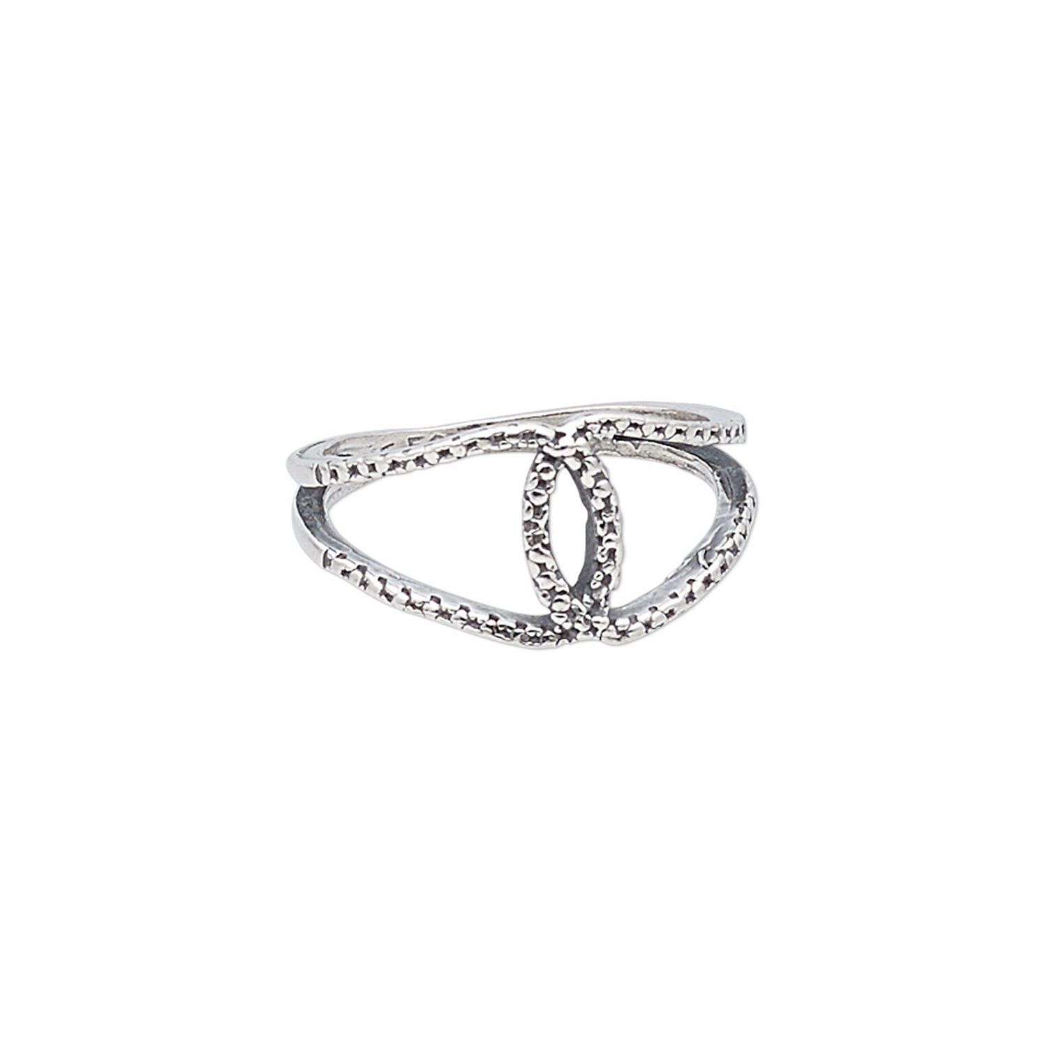One can never have too many rings. This beautiful sterling silver ring has a textured band for surface intrigue and a unique, interconnected shape reminiscent of popular minimalist, cutout designs. Ideal for stacking with other rings or wearing in tangent with rings on other fingers to achieve a personalized look.