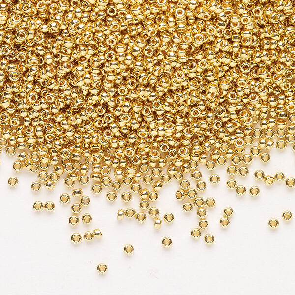 Seed bead, Miyuki, glass, pkg/250g, #15 rocaille, opaque 24Kt gold-plated, (RR-191).