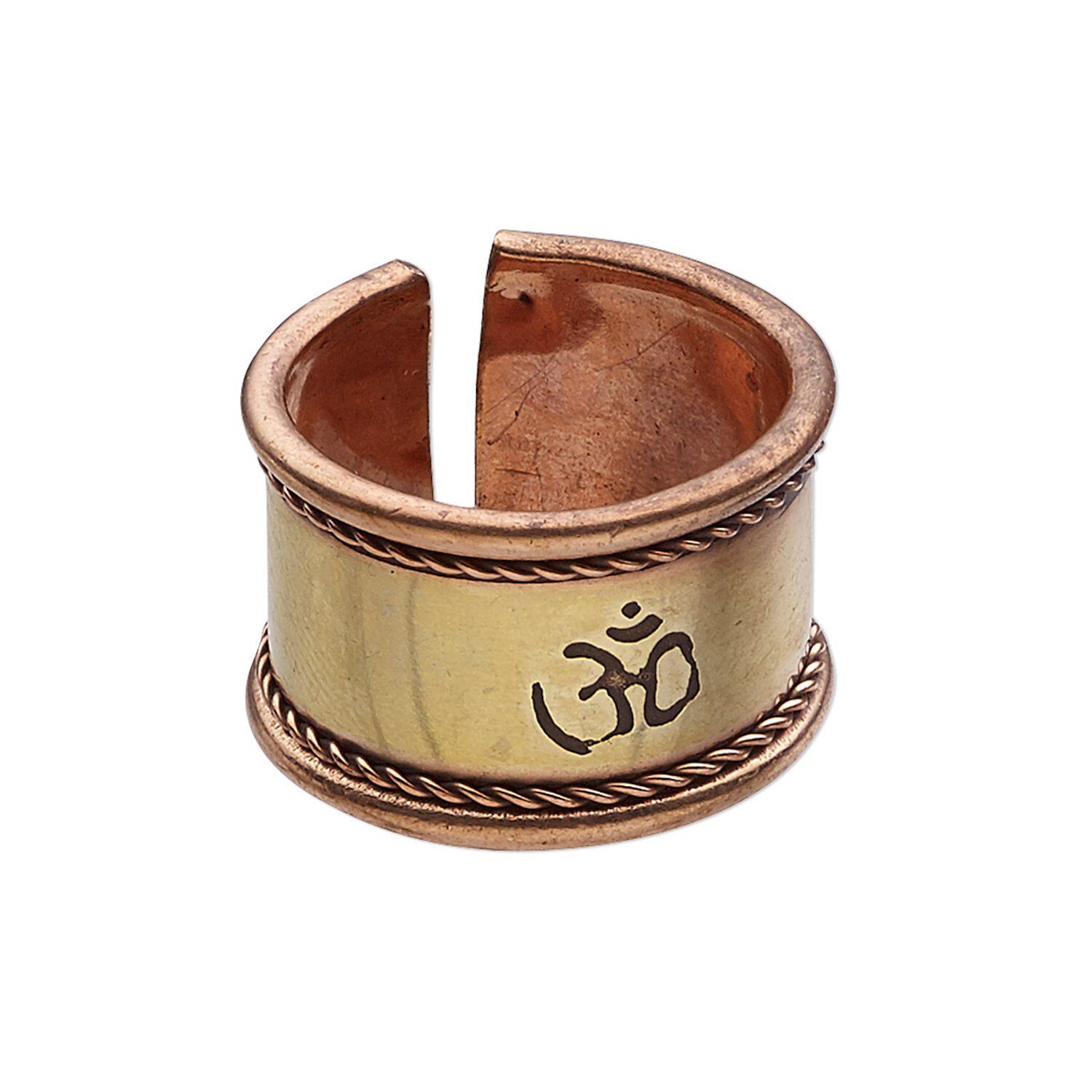 The brilliant gleam of copper is accented with antiqued brass in this wide-banded ring etched with the Om symbol. This symbol, also spelled Aum, is a primary concept in Hinduism representing the cosmic beginning of creation.
