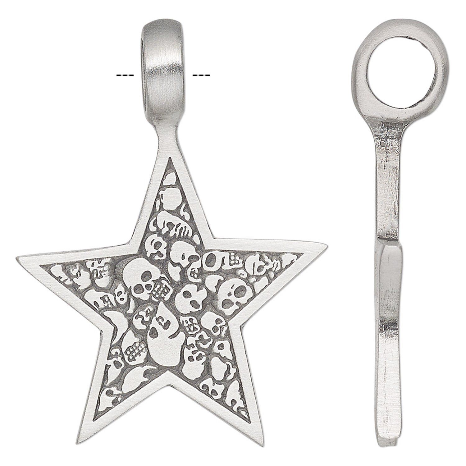This genuine pewter (tin-based alloy) star pendant is well-polished, making it appealing for use in both men's and women's jewelry. The extra-large bail (approximately 7mm inside diameter) easily accepts leather, custom kumihimo cords, multiple chains and more. Skulls are popular additions to men's and alternative-style jewelry designs.