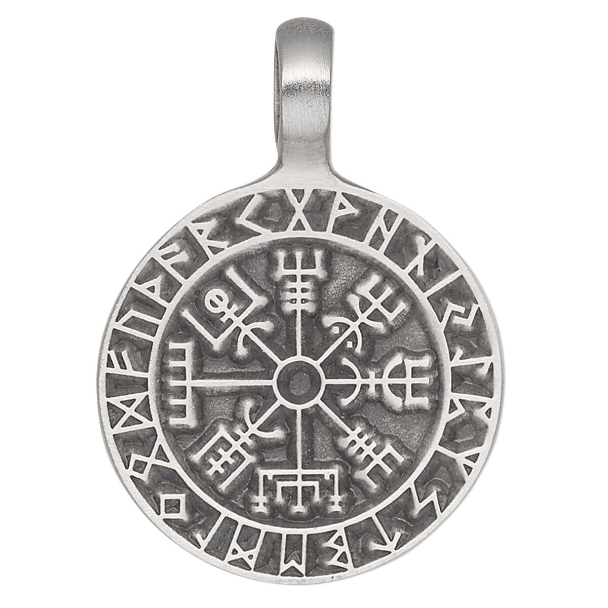 This genuine pewter (tin-based alloy) pendant with runes is well-polished, making it appealing for use in both men's and women's jewelry. The extra-large bail (approximately 7mm inside diameter) easily accepts leather, custom kumihimo cords, multiple chains and more. The Vegvísir was an Old Norse symbol of a magic stave that helped guide you through storms and other harsh weather, which is commonly referred to as a Viking compass.