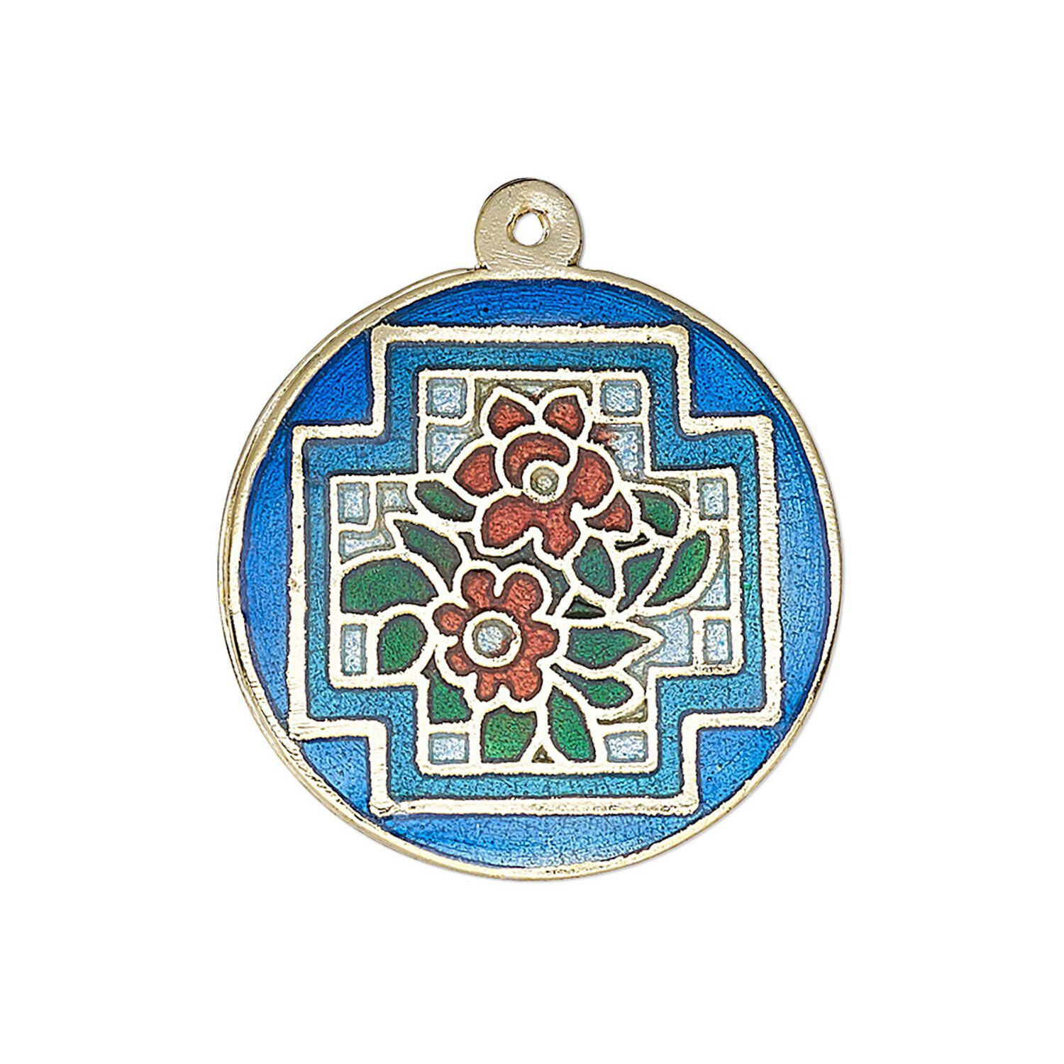Drop, enamel and gold-finished brass, multicolored, 25-26mm single-sided flat round with double flower design. Sold per pkg of 2.
