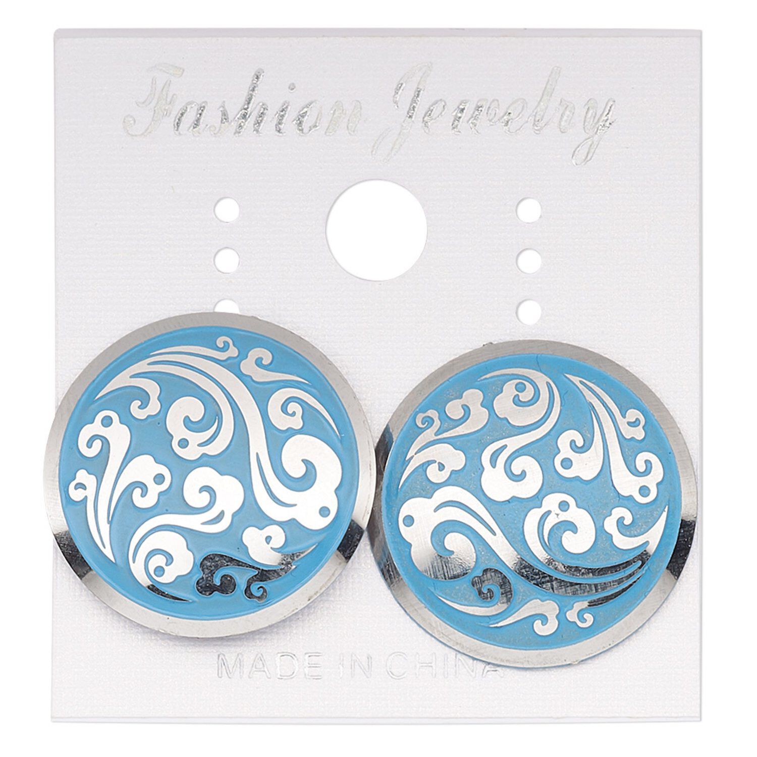 Earstud, stainless steel, blue patina, 20mm round with fancy swirl design. Sold per pair.