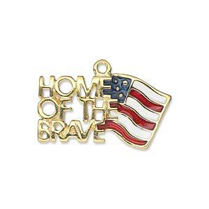 Charm, gold-finished "pewter" (zinc-based alloy) and enamel, red / white / blue, 28x15mm USA flag and "Home of the Brave." Sold individually.