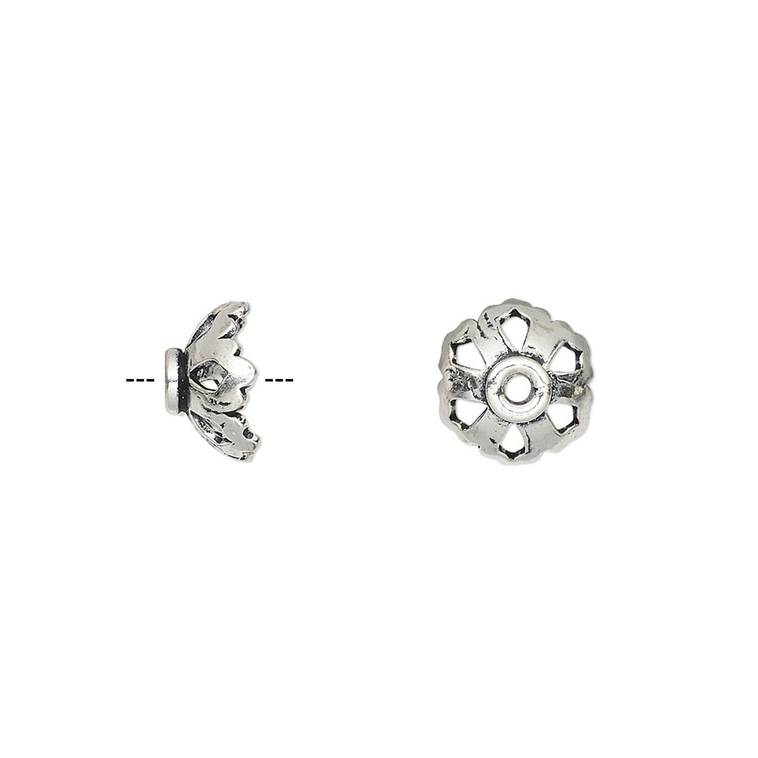 Bead cap, antiqued sterling silver, 9x4mm flower with cutout design, fits 8-10mm bead. Sold per pkg of 6.