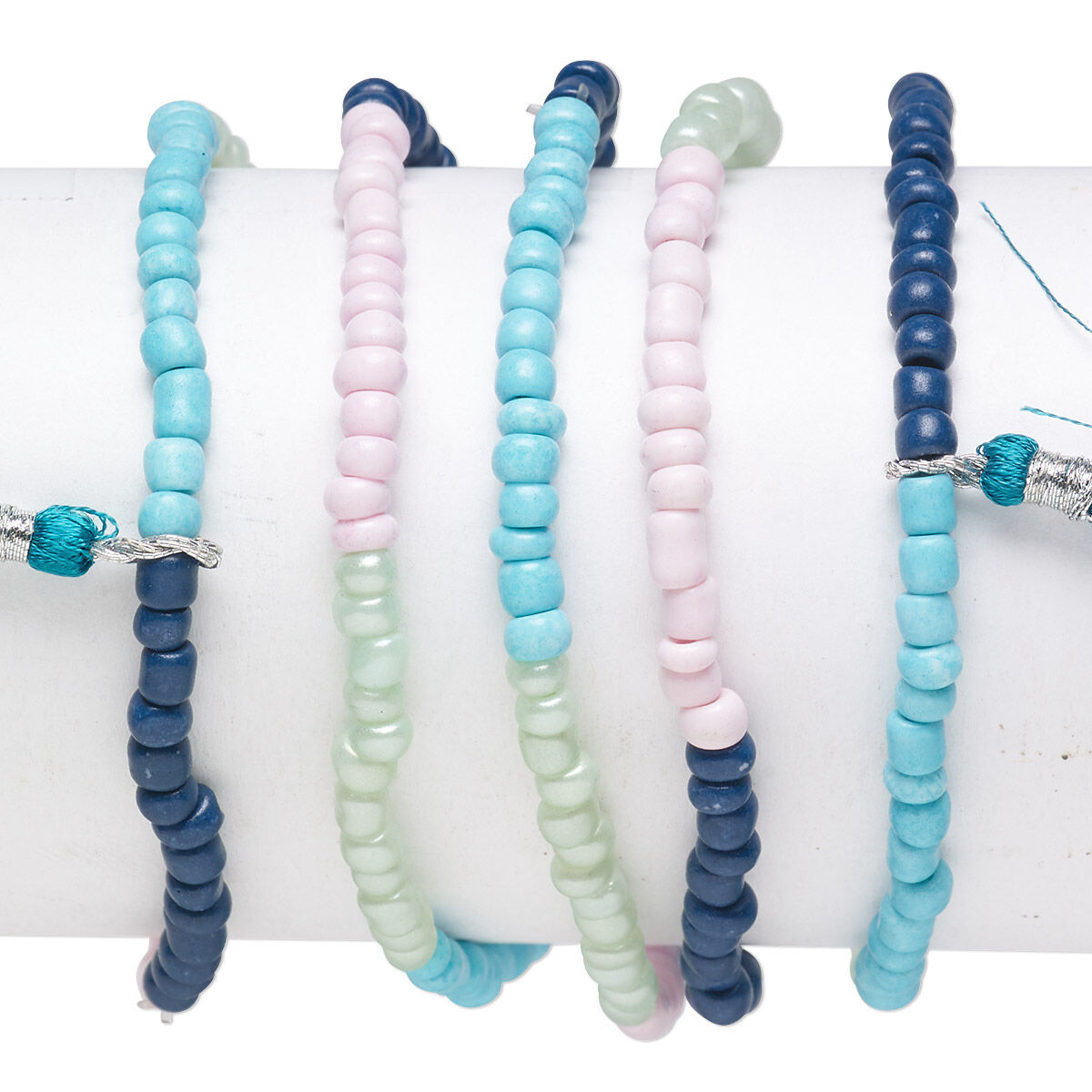 Bracelet mix, stretch, glass, pastel multicolored, #6 round with 45mm tassel, 7-1/2 inches. Sold per pkg of 5.