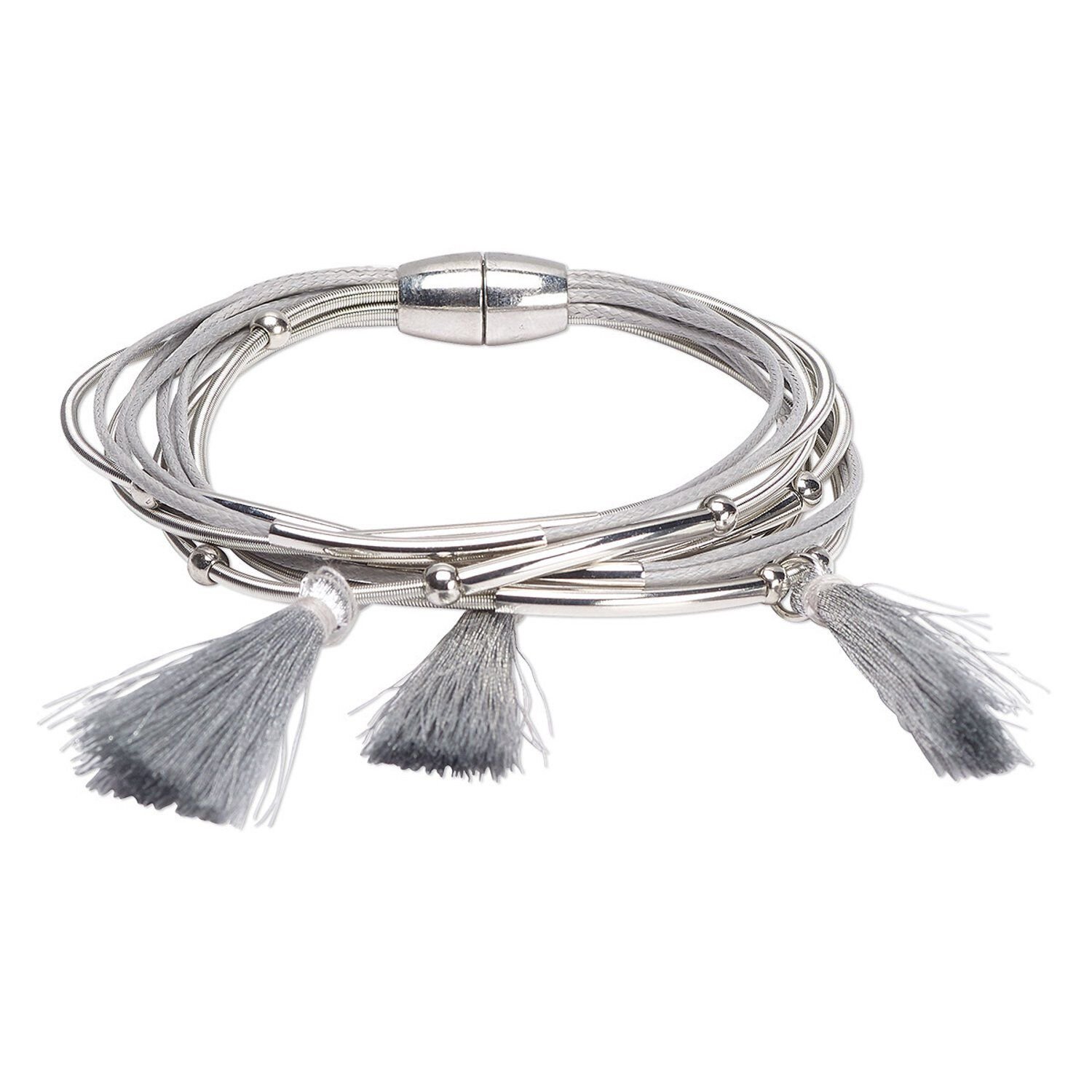 Bracelet, 10-strand, nylon / waxed cotton cord / silver-finished "pewter" (zinc-based alloy) / steel, 7.5mm wide with tassels, 7 inches with magnetic closure. Sold individually.