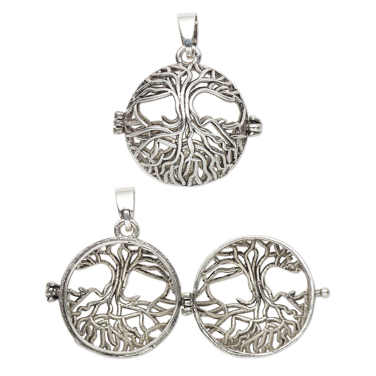 Drop, antique silver-finished brass, 26mm round bead cage with cutout tree of life design and safety latch, fits up to 18mm bead. Sold individually.