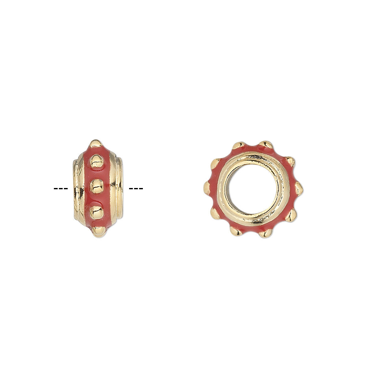 Bead, Dione®, gold-finished "pewter" (zinc-based alloy) and enamel, red, 12x6mm beaded rondelle with 5mm hole. Sold individually.