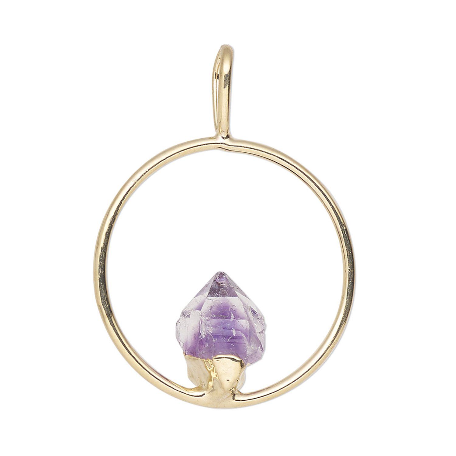 Add a touch of organic beauty to any outfit with this stunning pendant. Rich gold plating gives a warm glow to this simple yet elegant piece, and the open round design allows the amethyst freeform point to be the main attraction. This pendant is lovely by itself or layered, making it perfect for any occasion.