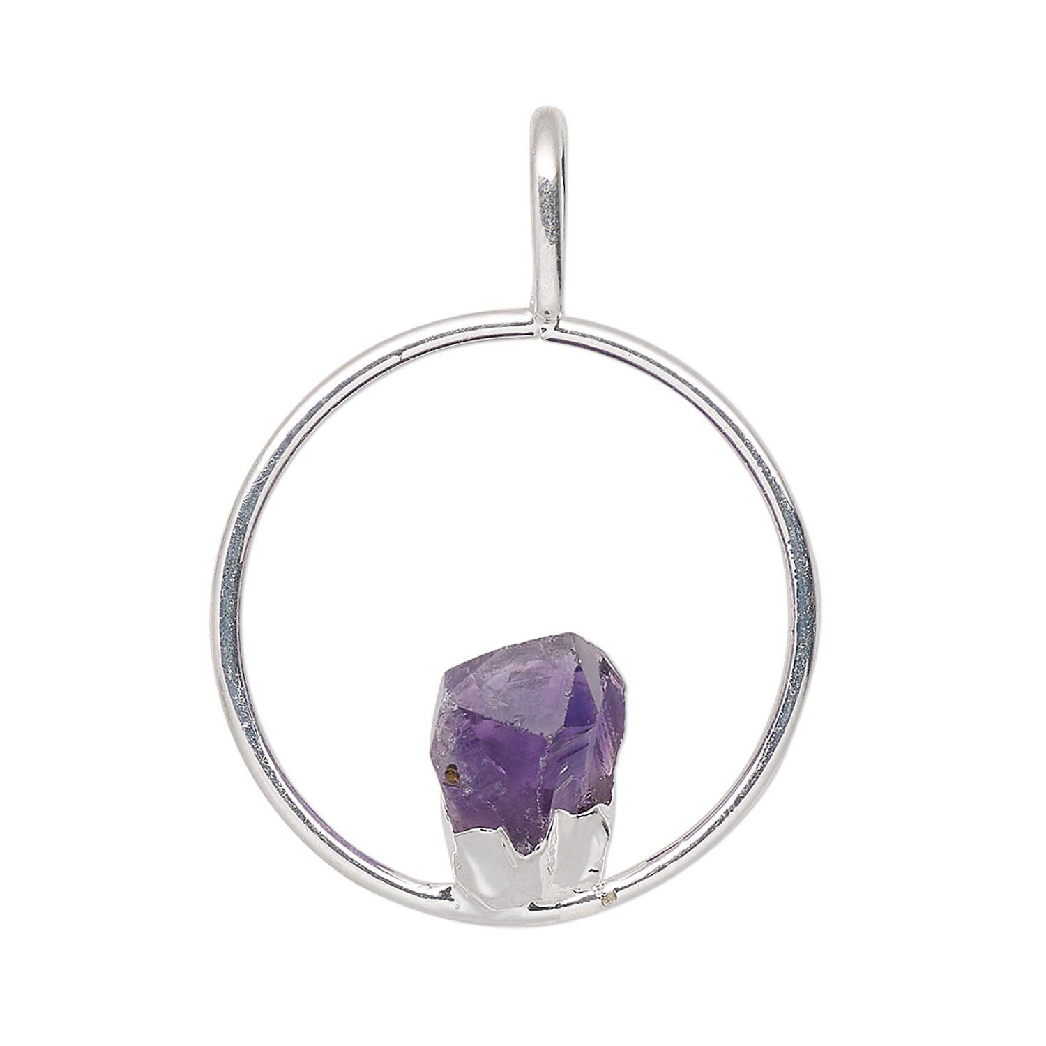 Add a touch of organic beauty to any outfit with this stunning pendant. Rich silver plating gives a cool gleam to this simple yet elegant piece, and the open round design allows the amethyst freeform point to be the main attraction. This pendant is lovely by itself or layered, making it perfect for any occasion.