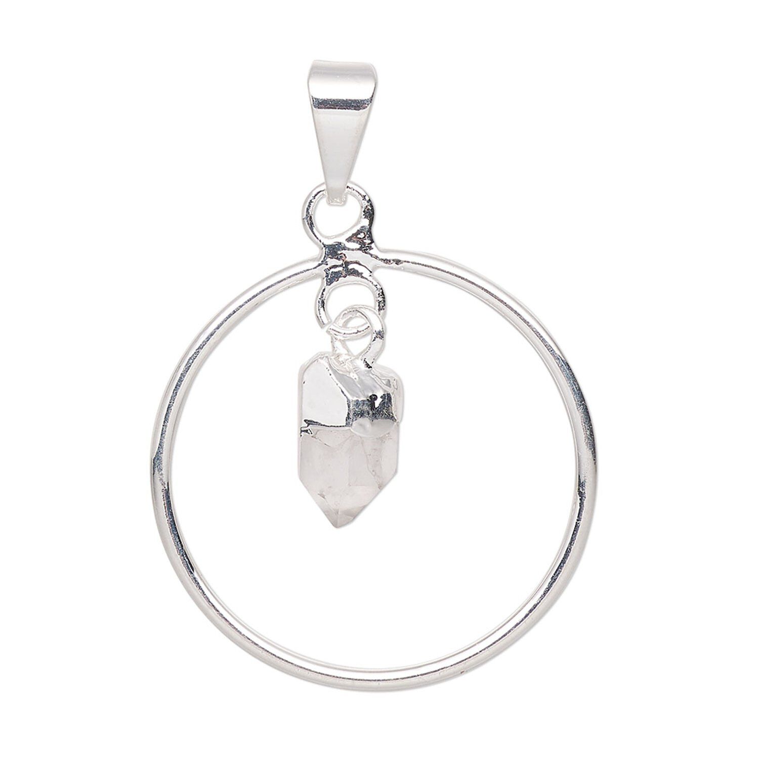 Pendant, Everyday Jewelry, silver-plated brass and quartz crystal (natural), 30x25mm-32x27mm open round. Sold individually.