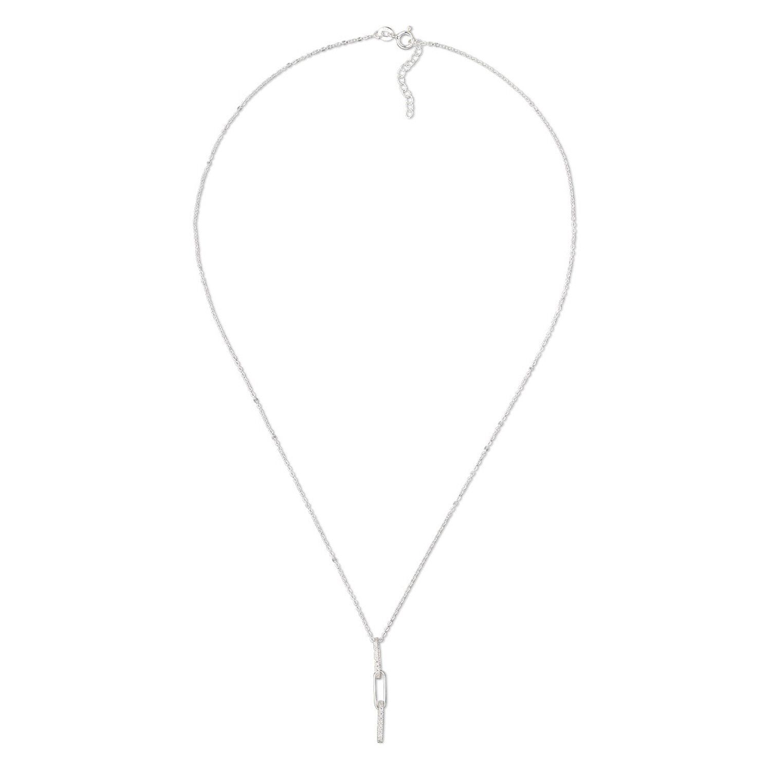 This ready-to-wear necklace features paper clip chain rendered in sterling silver—a customer-favorite metal for its precious metal gleam. Two links are adorned with light-catching cubic zirconia, while the center link is smooth. Necklace has an anti-tarnish coating.