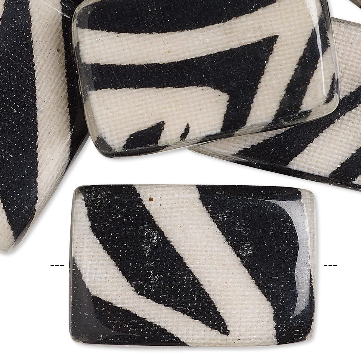 Bead, wood / cotton / acrylic, black and cream, 30x20mm double-sided flat rectangle with zebra stripe pattern. Sold per pkg of 8.