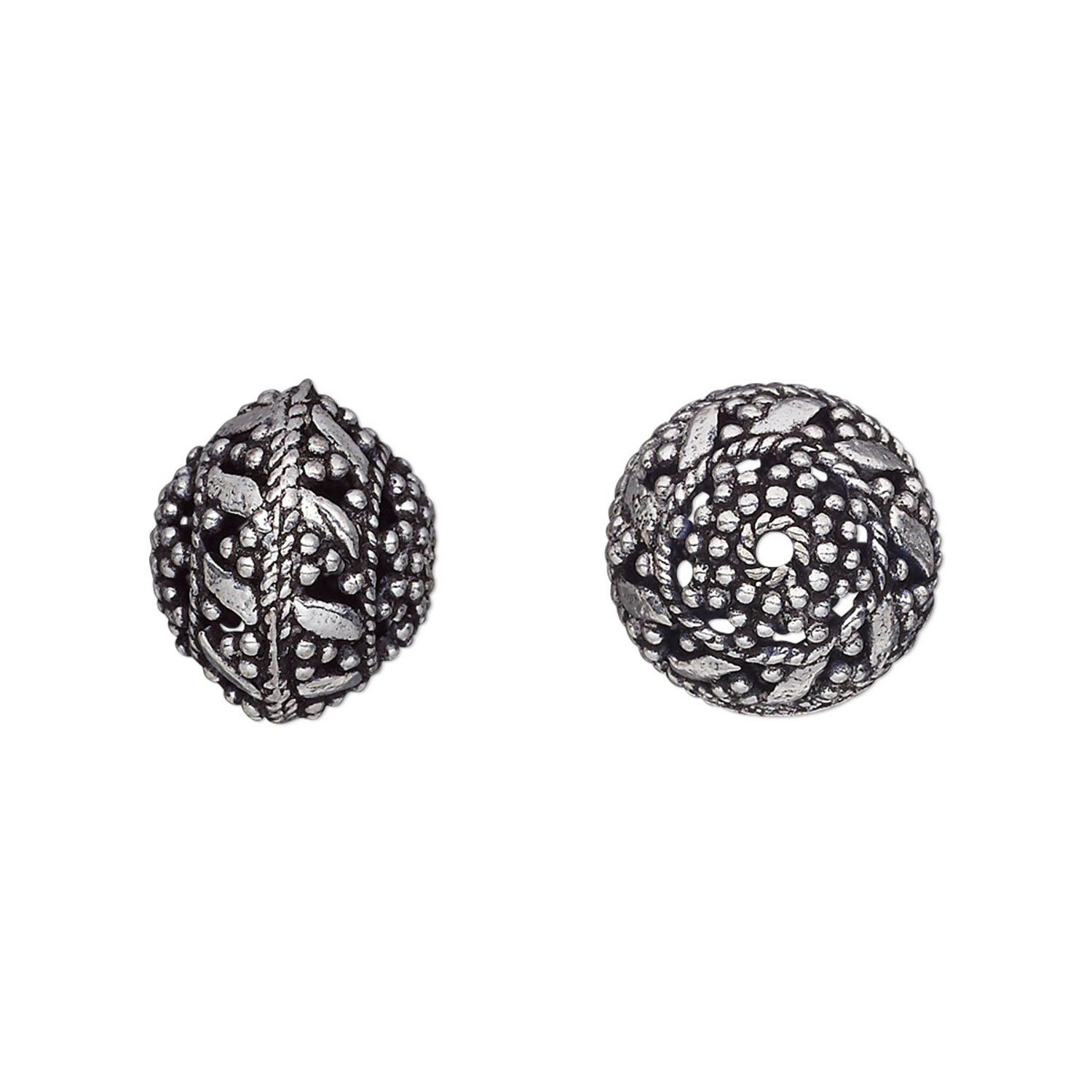 Lightweight brass beads showcase Byzantine-inspired patterns in complex swirls, dots and floral details. Each bead is plated with silver, then antique to bring out its intricate surface designs.
