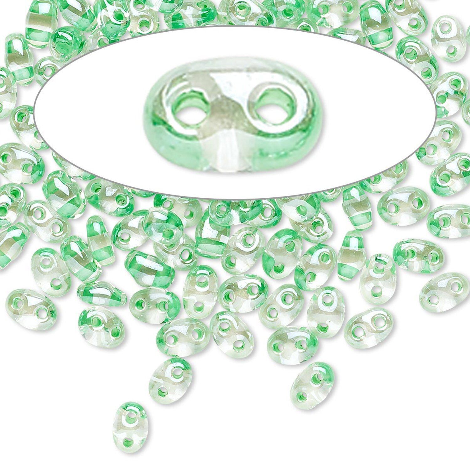 Seed bead, Preciosa Twin™ Czech glass, pkg/10g, 5x2.5mm oval, transparent light green terra color-lined clear, (38656).