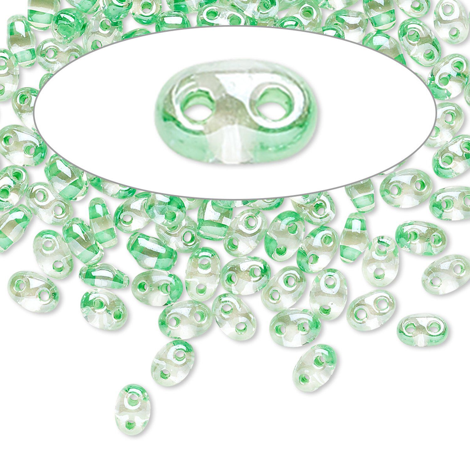 Seed bead, Preciosa Twin™ Czech glass, pkg/50g, 5x2.5mm oval, transparent light green terra color-lined clear, (38656).