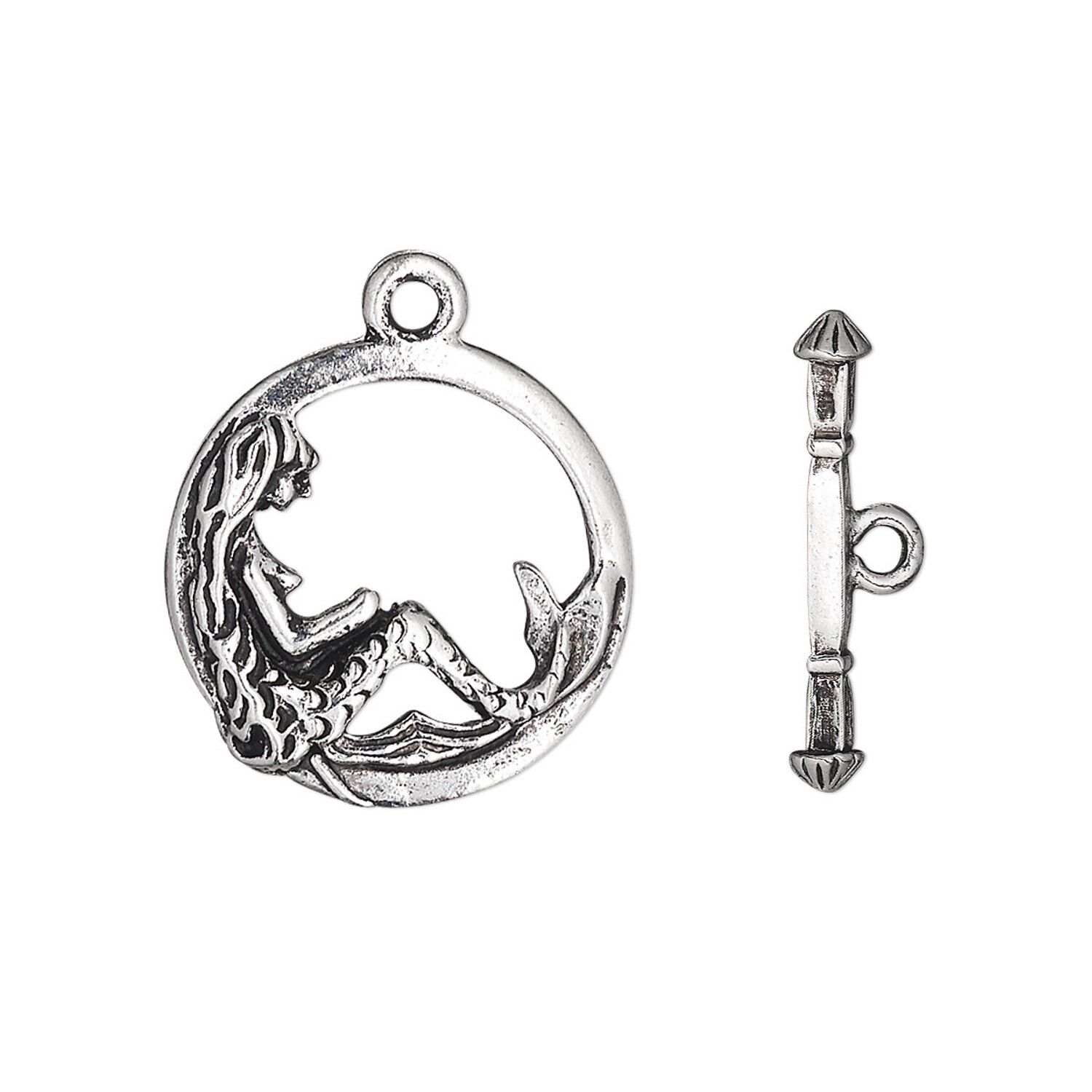 Antique silver-plated pewter (tin-based alloy) toggle clasp has a detailed two-sided mermaid design. Lightweight, cost-effective alternative to precious metal.
