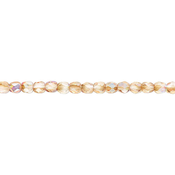 Machine-cut glass beads from the Czech Republic are known for their quality, craftsmanship, vivid colors and scintillating sparkle. As they turn in the light, these clear celsian AB beads unite the warmth of brilliant sunshine with the hues of a dazzling rainbow.
