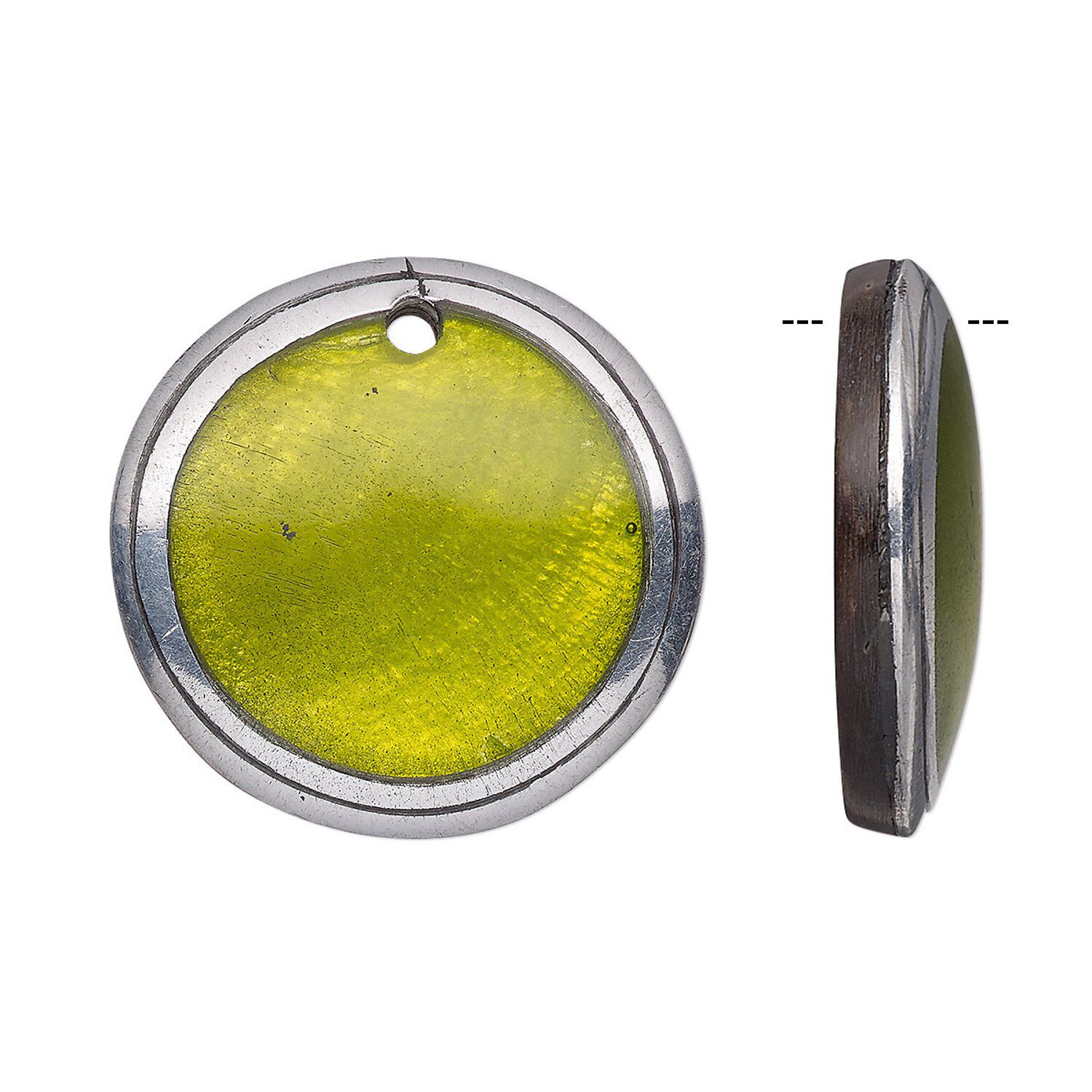 Drop, wood / Capiz shell / resin / aluminum (natural / dyed / assembled), green and clear, 24mm single-sided flat round. Sold individually.