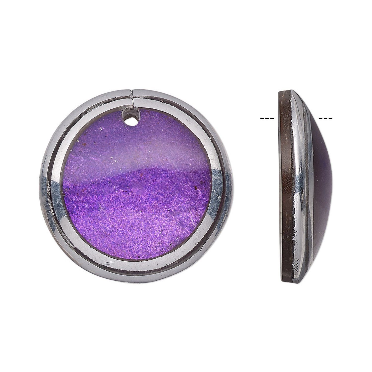 Drop, wood / Capiz shell / resin / aluminum (natural / dyed / assembled), purple and clear, 24mm single-sided flat round. Sold individually.