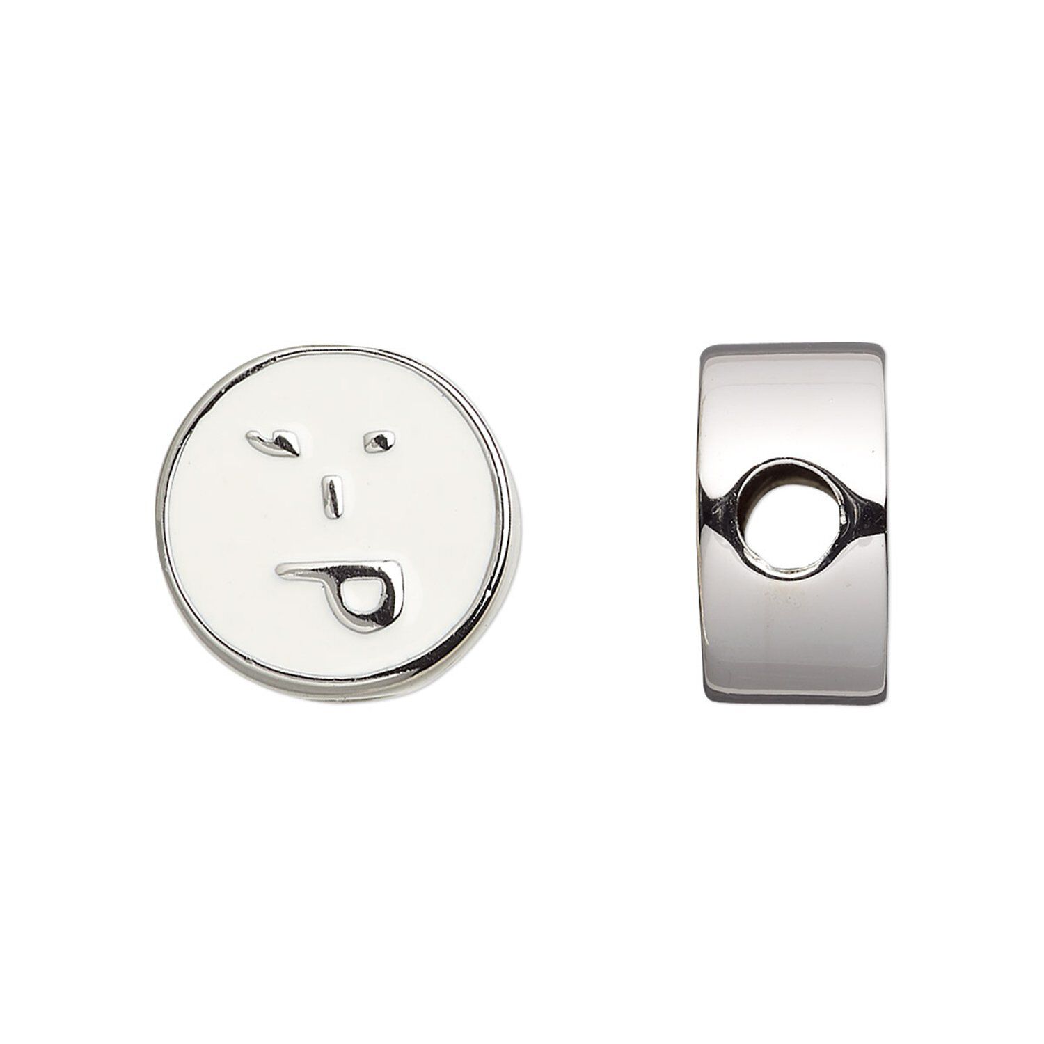 Bead, Dione®, enamel and silver-finished "pewter" (zinc-based alloy), white, 16mm double-sided flat round with playful emoticon face and 4mm hole. Sold individually.