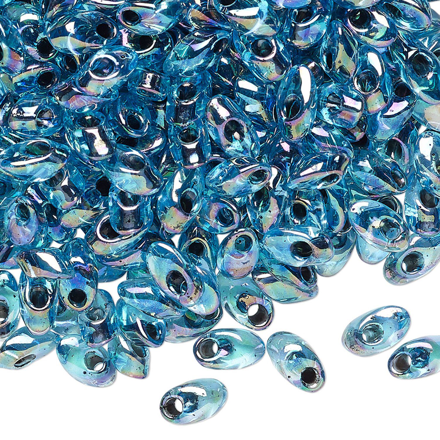 Seed bead, Miyuki, glass, pkg/50g, 7x4mm long magatama, translucent black inside dyed color aqua blue, (LMA-2168).