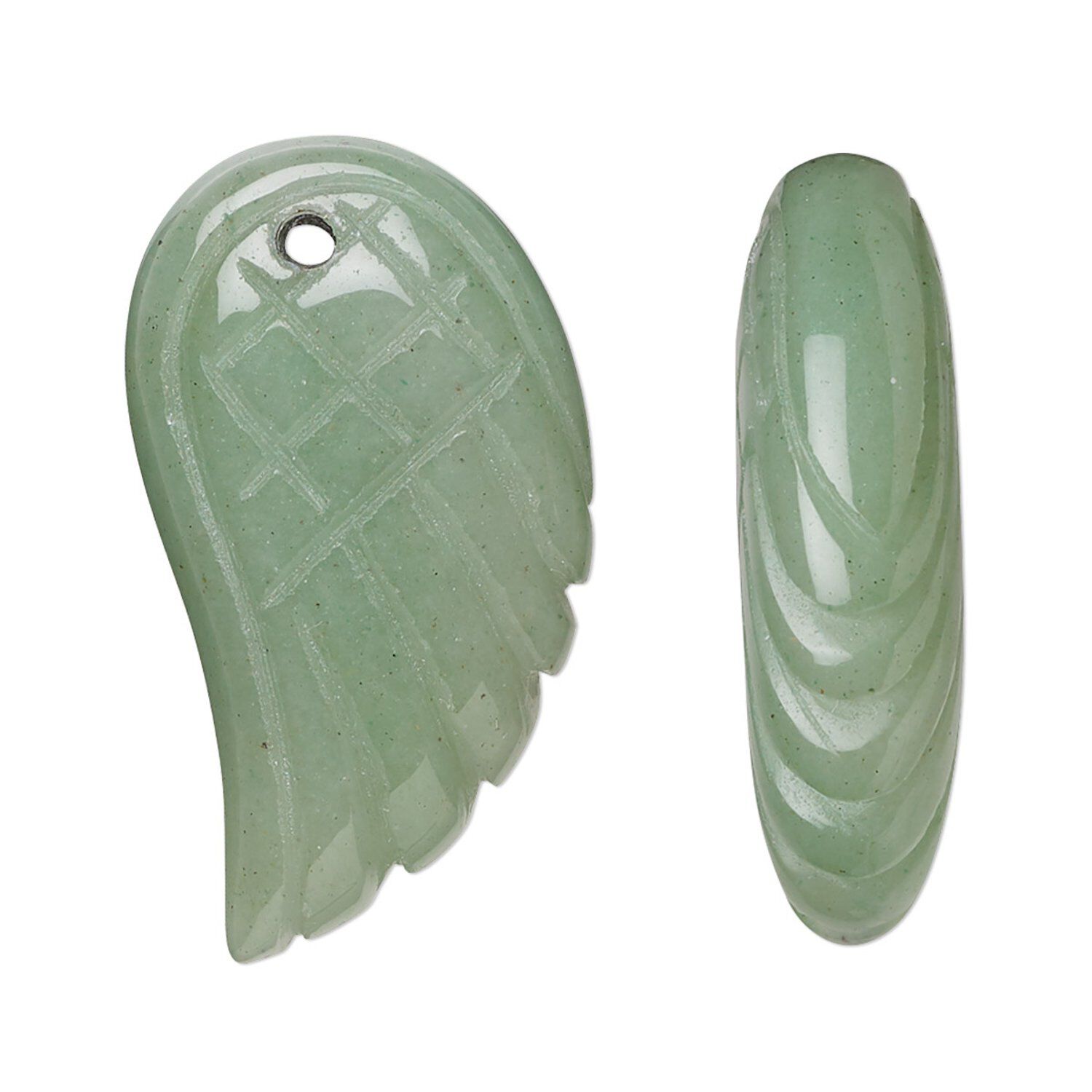 Use hand-cut wing focal components to create uplifting jewelry designs. The green aventurine wing is carved on both sides so no matter how it's dangling, the design shows. Aventurine is a metamorphic rock, meaning it is made up of more than one mineral. Green aventurine, according to metaphysical properties, is believed to ease mental and emotional trauma as well as bring calmness.