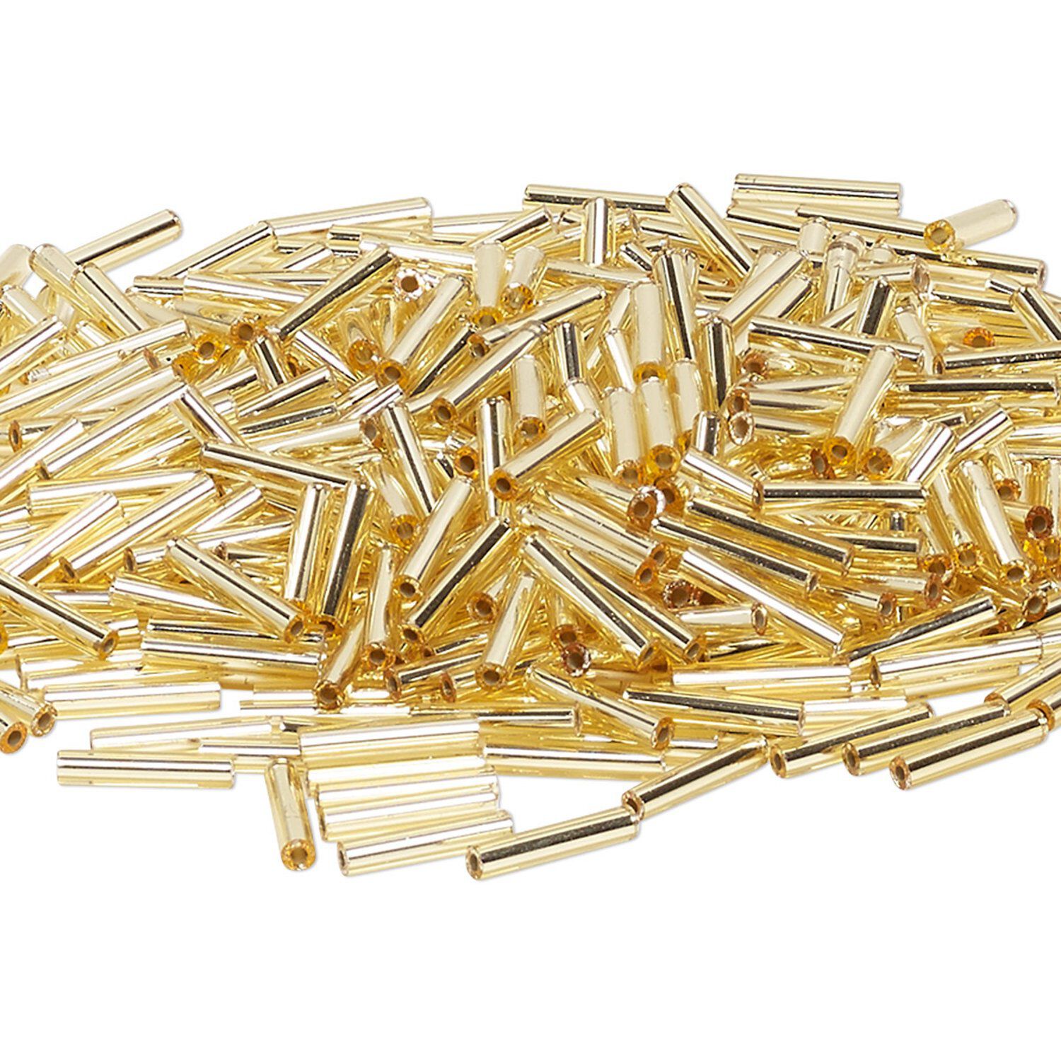 Bead, Miyuki, bugle bead, glass, pkg/250 g, 12x2.4mm center-drilled, silver-lined translucent gold, (RBU-0003).