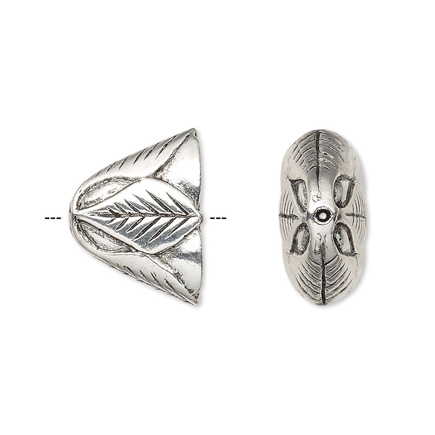 Cone, antique silver-plated pewter (tin-based alloy), 18x13x9mm flat with leaf design, 14x5.5mm inside diameter. Sold per pkg of 2.
