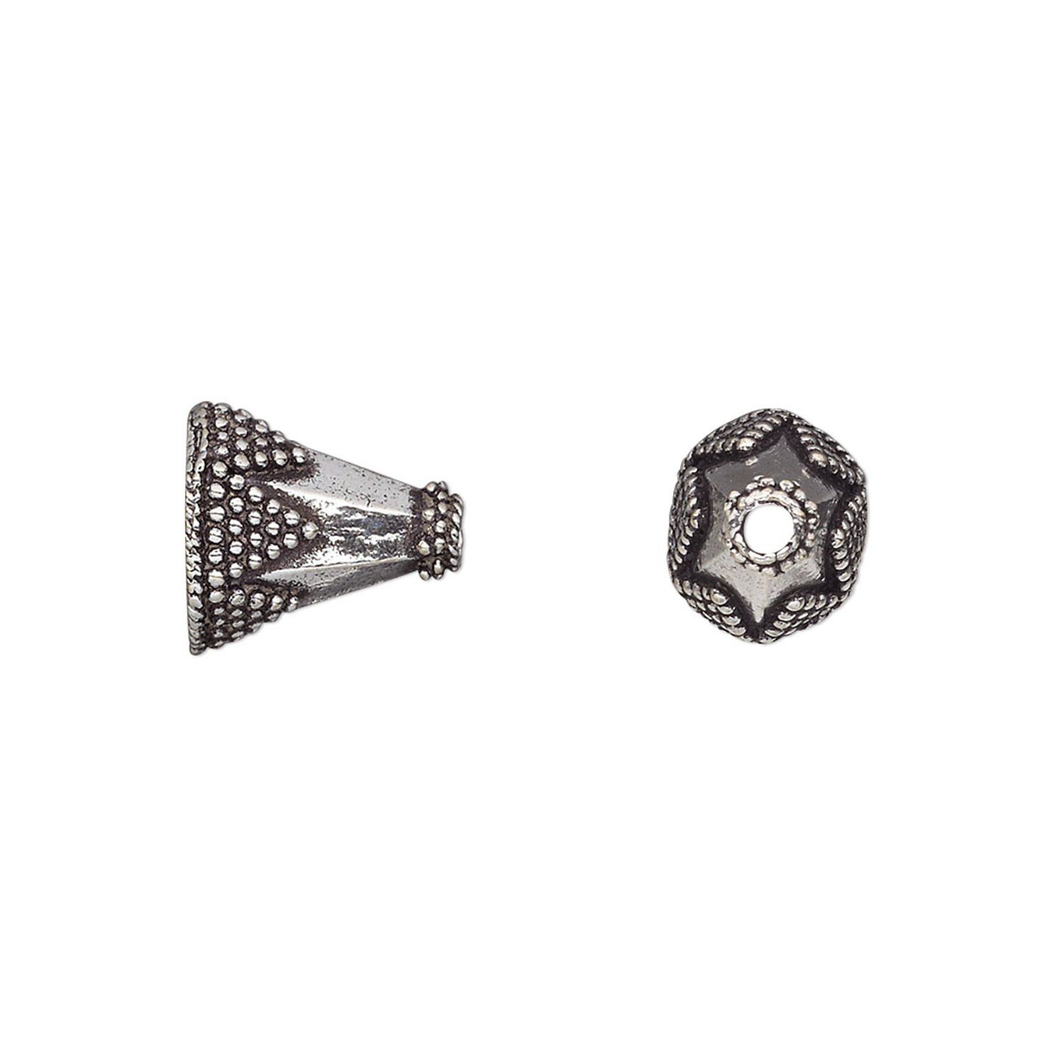 Cone, antique silver-plated brass, 11x10mm beaded hexagonal, 7x6mm hole. Sold per pkg of 6.