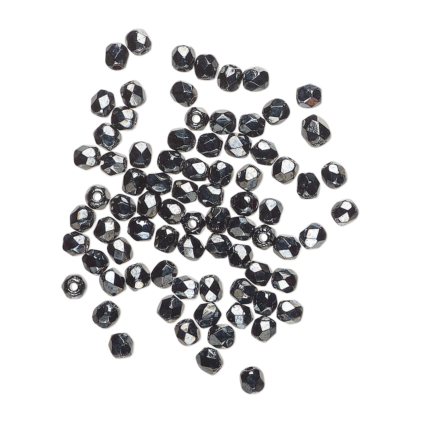 Opaque jet black fire-polished glass beads are crafted from quality pressed glass and machine-faceted using German technology, then given a metallic hematite coating. Slight imperfections are to be expected and add to the allure of these much sought after beads.
