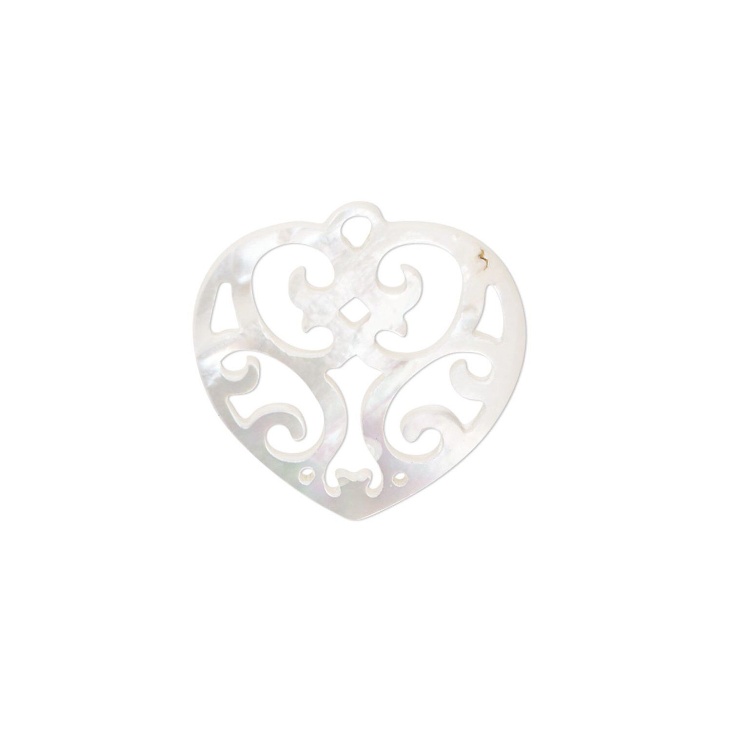 Drop, mother-of-pearl shell (bleached), 20mm heart with cutout design, Mohs hardness 3-1/2. Sold individually.