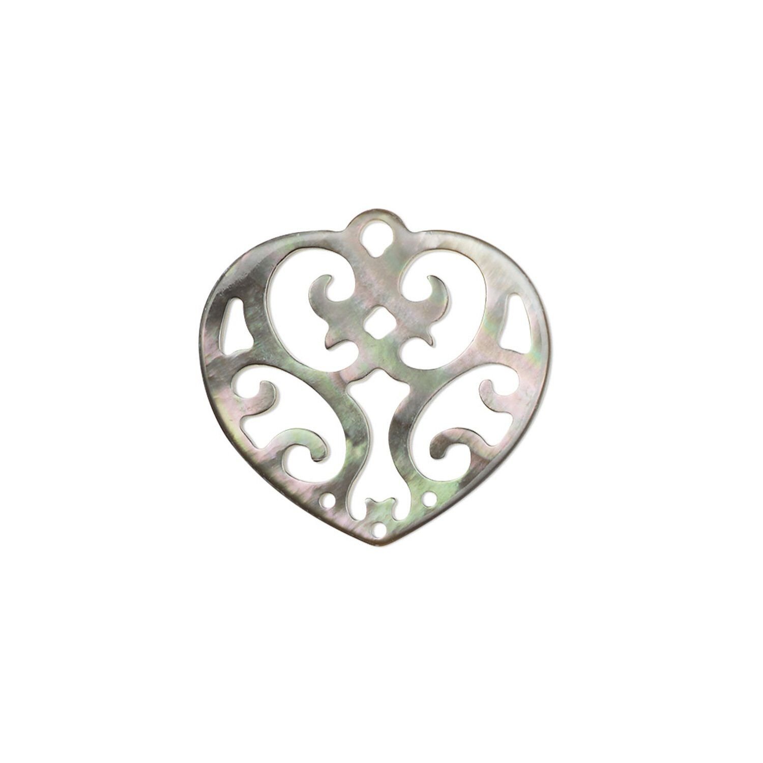 Drop, black lip shell (natural), 20mm heart with cutout design, Mohs hardness 3-1/2. Sold individually.