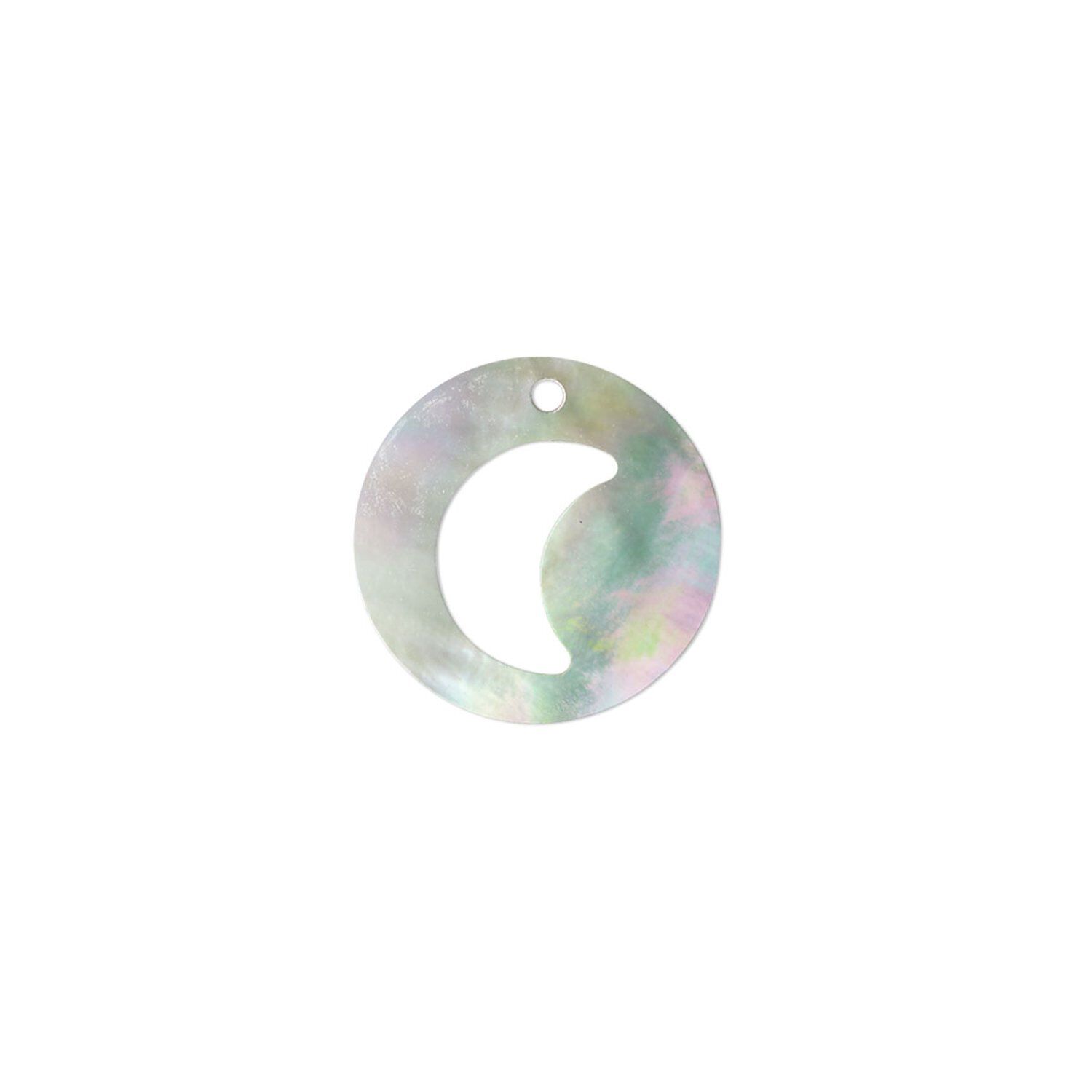 Drop, black lip shell (natural), 15mm round with cutout moon, Mohs hardness 3-1/2. Sold individually.